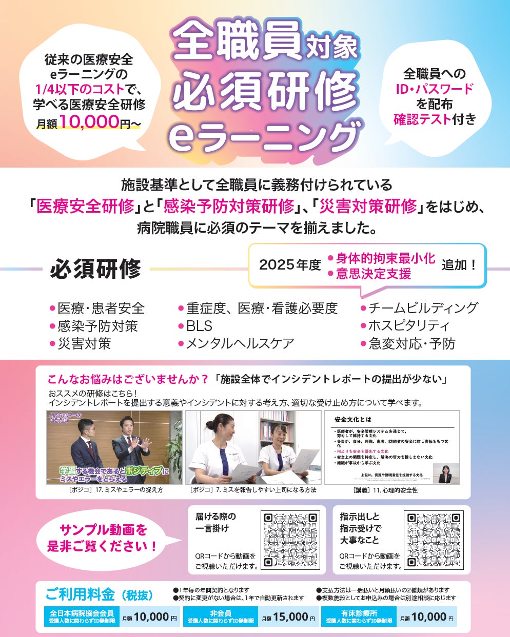当社で提供しているプログラム「必須研修」と「ポジコ」(ポジティブコミュニケーション)をまとめて一つのプラグラムにしました!施設基準として全職員に義務付けられている「医療安全研修」と「感染予防対策研修」をはじめ、病院職員に必須のテーマを揃えています。