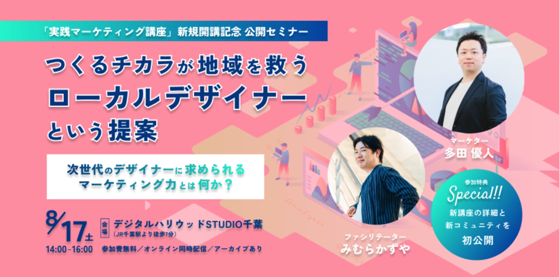 本セミナーでは、「ローカルデザイナー」の概念と、地域活性化におけるマーケティングの重要性について、弊社のD-CAM 事業責任者 多田 優人(ただ ゆうと)がさくら印刷教育コミュニティ事業部 コミュニティプロデューサーのみむら かずや氏と共に、深く掘り下げます。また、新規開講されるコラボ講座の詳細につきましては、本セミナーで公開いたします。