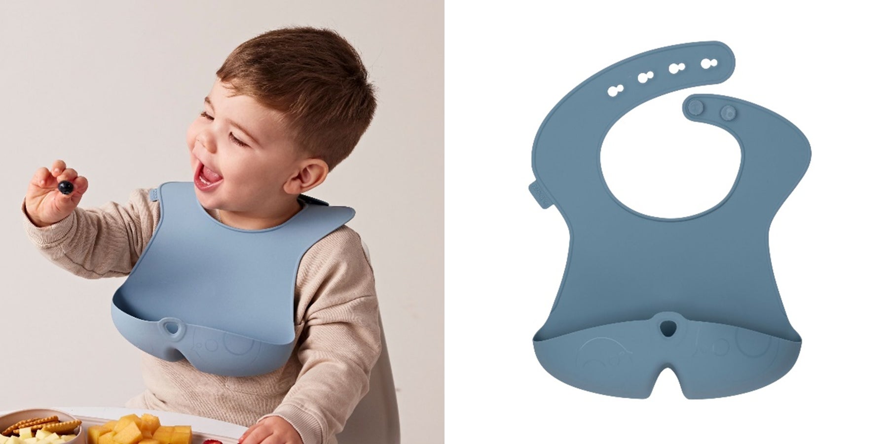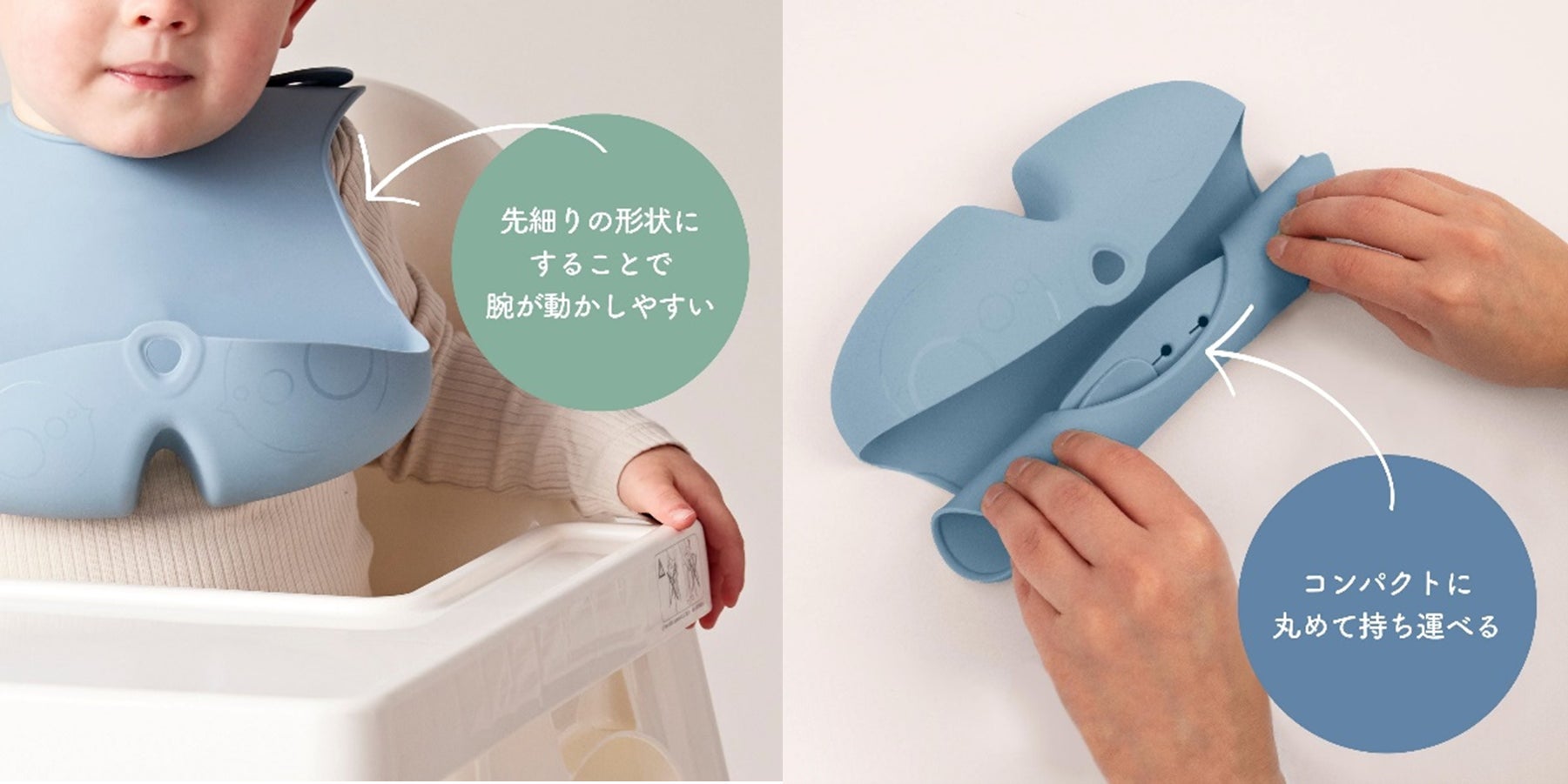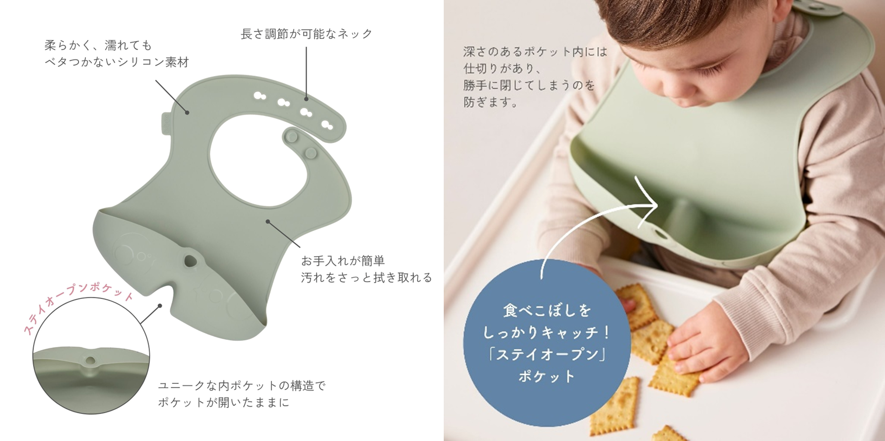 深さもあり、中に仕切りが付いた「ステイオープン」ポケット設計が特徴のシリコンビブです。ポケットが塞がらないことで、より多くの食べこぼしをキャッチできます。非毒性の食品用シリコーン(FDAシリコン)を使用し、水に濡れてもベタつかず、さっと拭き取れば汚れが取れるのでお手入れも簡単です。使用後は食洗機も使用できます。お出かけの際にはくるんと丸めて、コンパクトにできるので便利です。