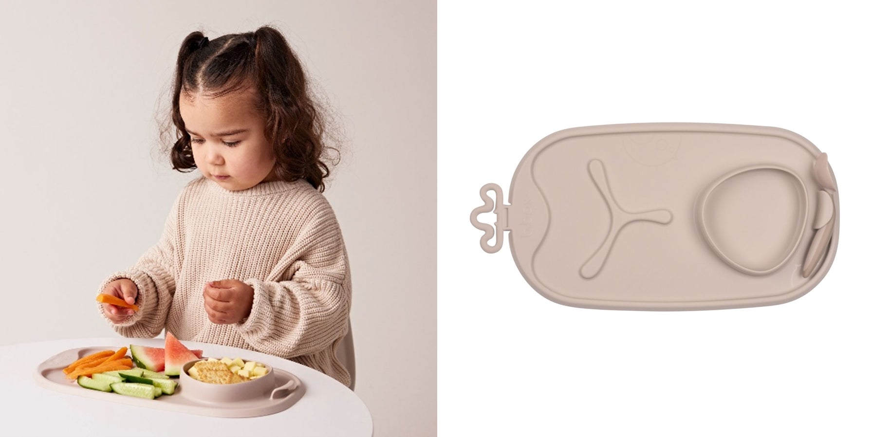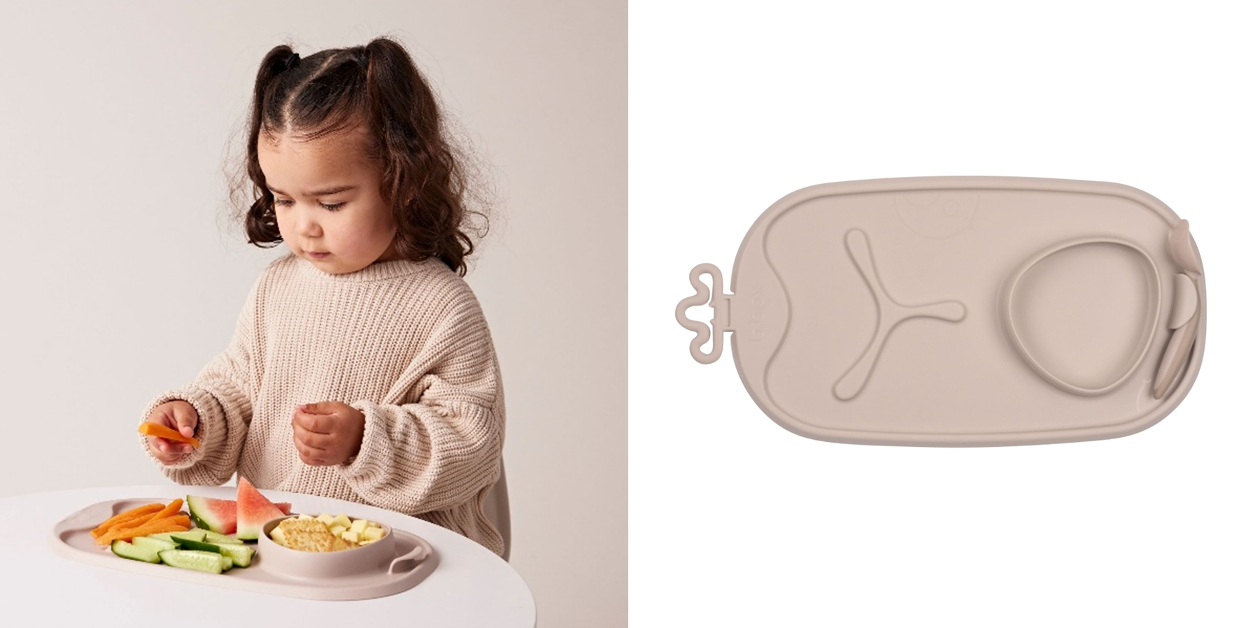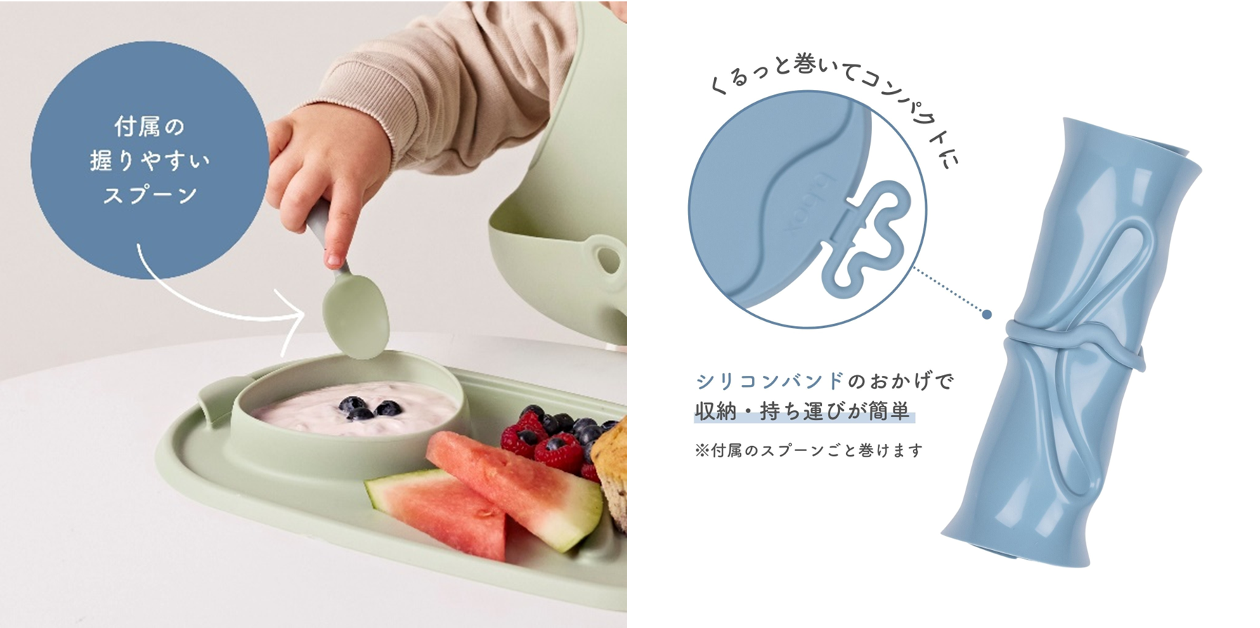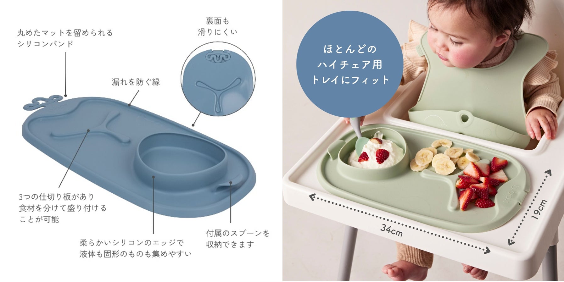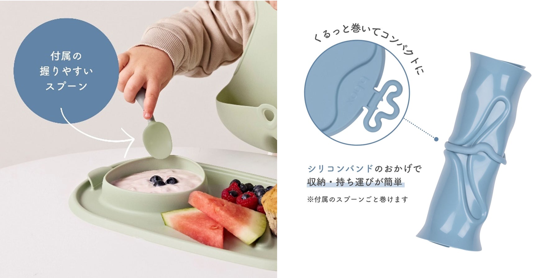 ボウルとプレートが一つになった、シリコーン製お食事マットです。プレート部分には3つの仕切りがついているので、食材を分けて盛り付けることができます。エッジが効いたボウル部分は、離乳食のようなペースト状も、固形の食品にもすくいやすくなっています。マットには小児作業療法士監修の使いやすいスプーンが付属しています。使い終わった後やお出かけの際には、くるんと丸めて持ち運べます。お家の食卓にもお出かけの際のテーブルにも置きやすいサイズです。