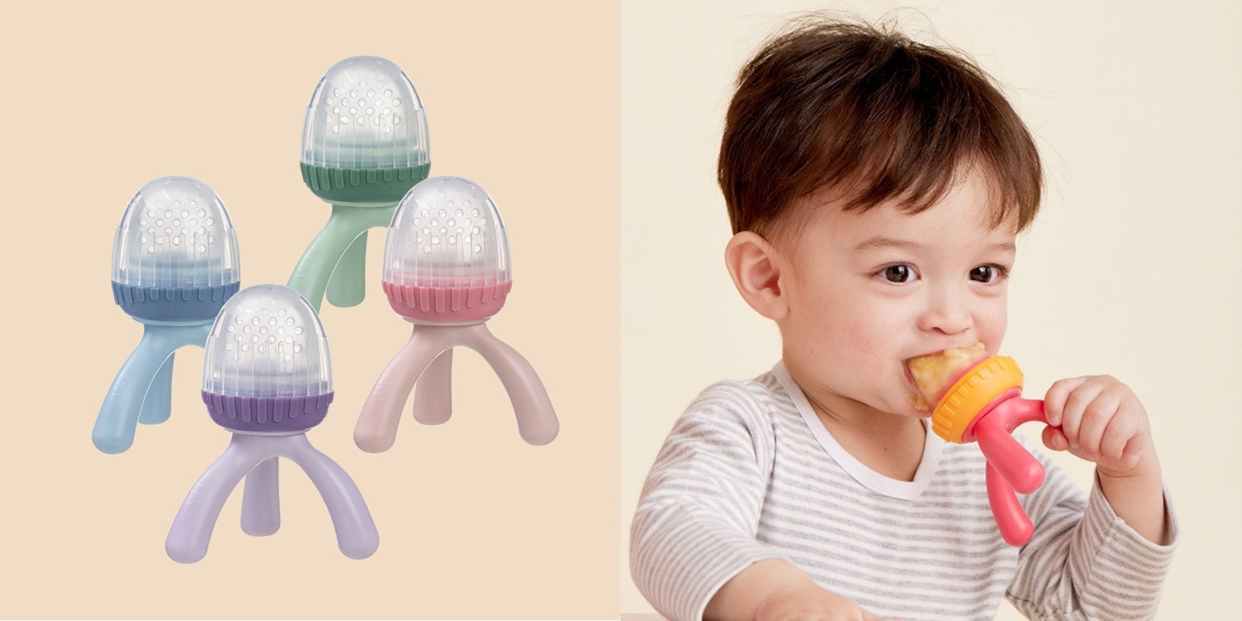 SNSでも注目度アップ中のフィーダーに新色が登場。今回の新作アイテムとのカラーコーデもできる淡い色合いです。かわいいアイテムで野菜や果物を楽しくもぐもぐしよう!食べものがポーチによって潰されて出てくることで、赤ちゃんは楽しく、安全な方法で食事をすることができる「Silicone Fresh Food Feeder (シリコンフレッシュフードフィーダー)」。蒸し野菜や果物など、自然な味を離乳食期に与えられます。(はじめはさつまいもやにんじん、バナナがおすすめ!)
