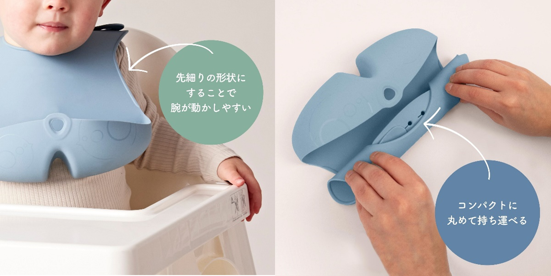 シリコンビブとお食事マットはお手入れが簡単で、どちらも使わない時にはくるんとコンパクトに丸めて収納ができるので、子連れのお出かけシーンにも便利です。また、フィーダーは離乳食初期の赤ちゃんにセットでおすすめのアイテムです。