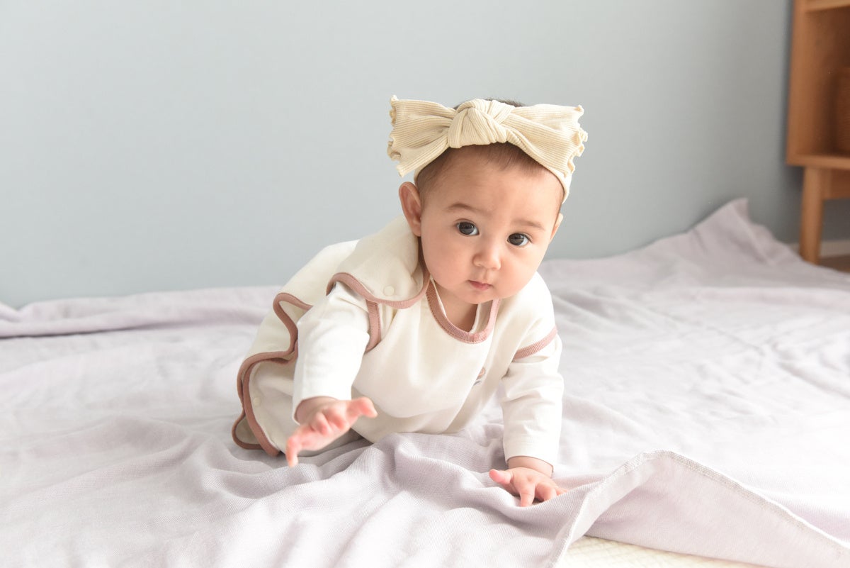 サイドボタンをパチパチと留めるだけの仕様で、まだ立ち上がれない赤ちゃんにも着せやすくなっています。