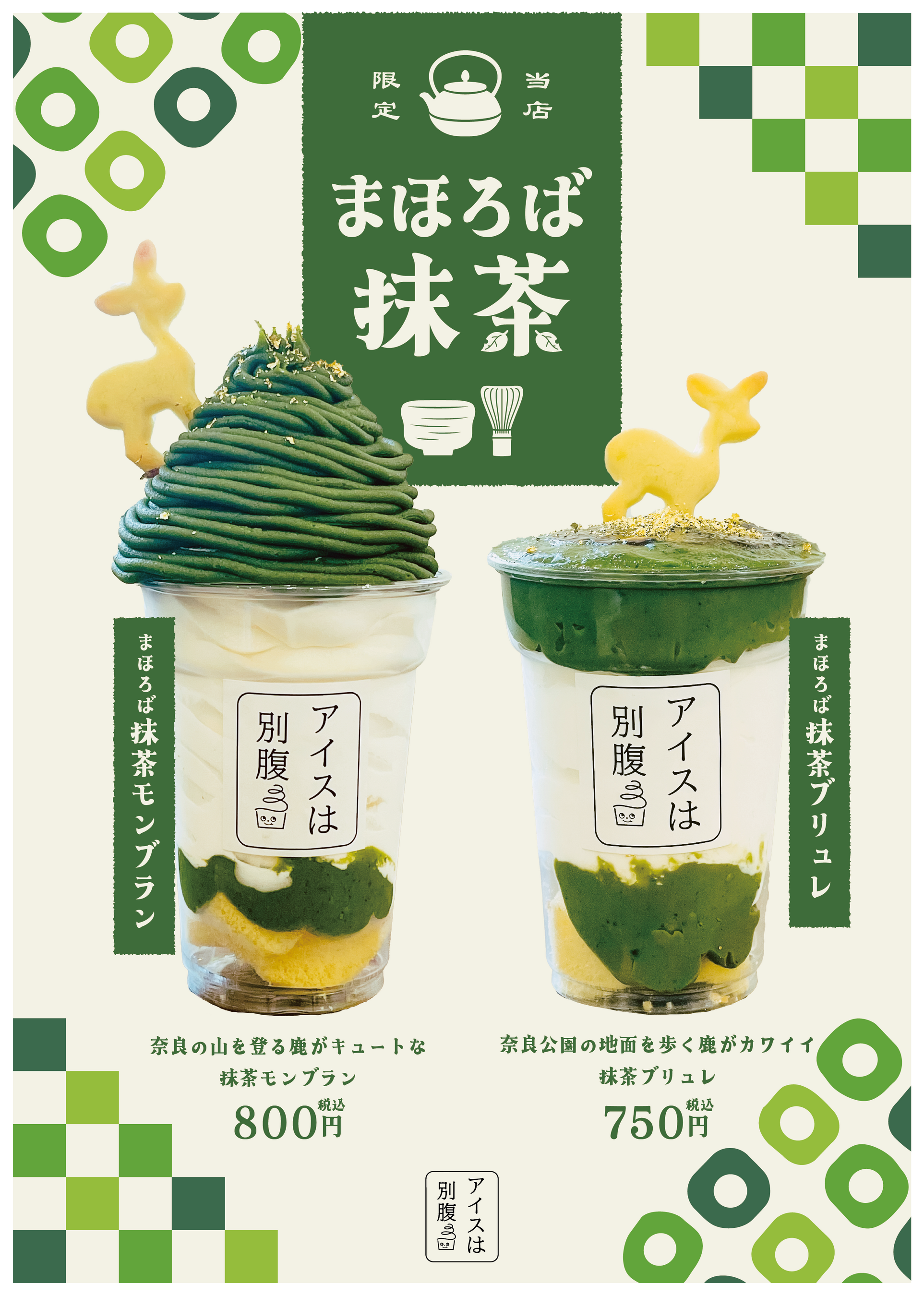 アイスは別腹大和郡山店限定の新商品「抹茶モンブランアイス」と「抹茶ブリュレアイス」のお披露目を兼ねて、6月1日(土)と2日(日)の二日間に関しては、先着50名様には、250円引きを実施します。お早目のご来店よろしくお願いします。
