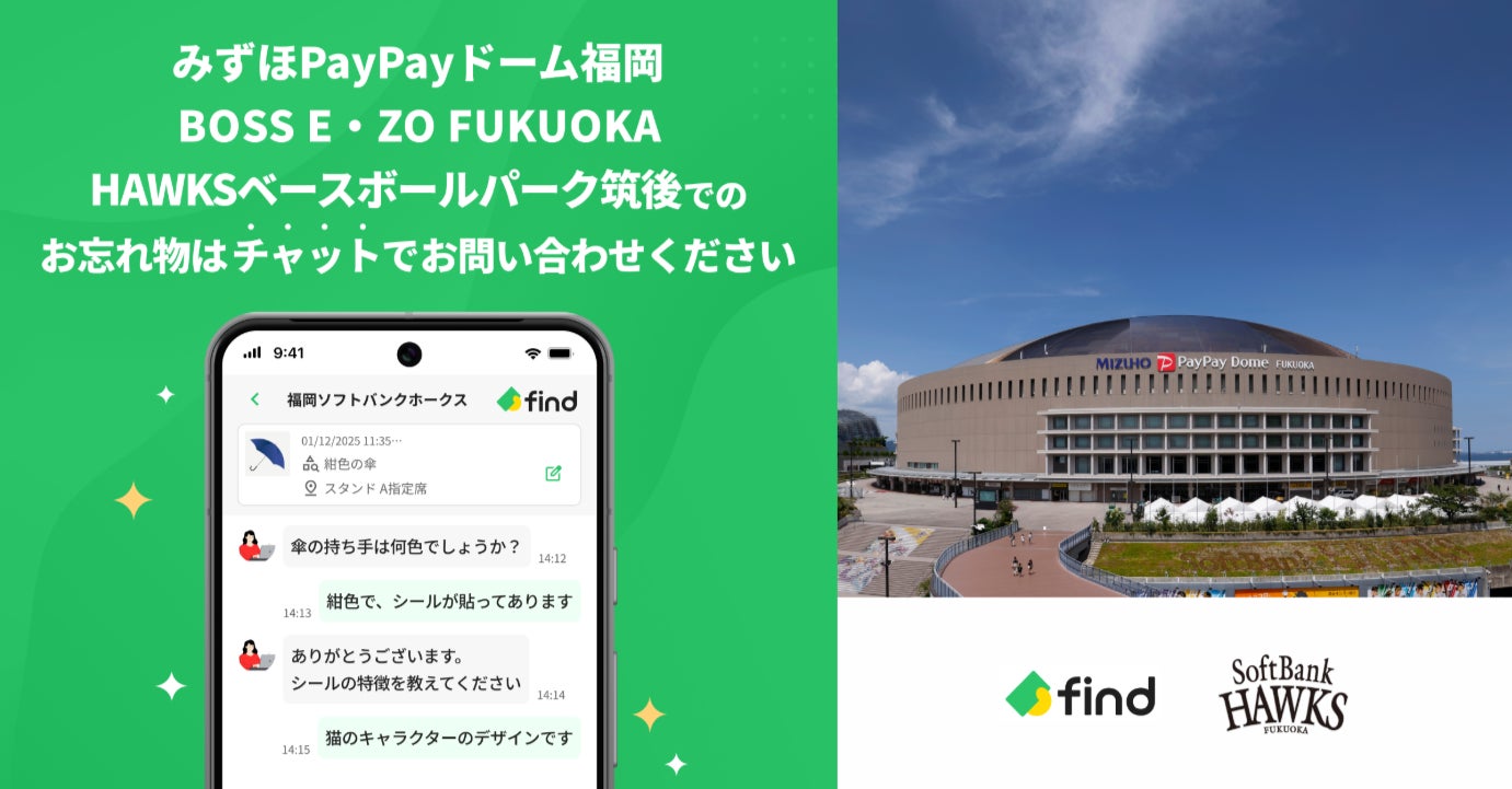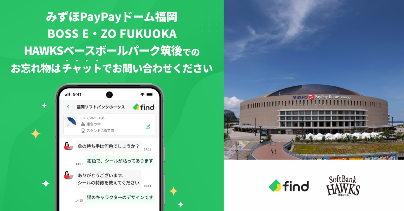 このたび、株式会社find(本社:東京都港区、代表取締役CEO:高島 彬、以下「find」)が提供する「落とし物クラウドfind」を福岡ソフトバンクホークス株式会社(以下「福岡ソフトバンクホークス」)の運営施設へ導入します。
