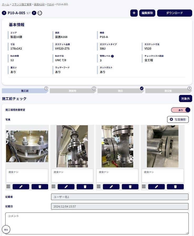 「施工前・開放時・復旧・復旧後」の各工程を記録し、締結作業のレベルも段階別に管理。画像やファイルも添付でき、詳細な施工履歴を蓄積。報告に対してオーナー側がコメントできるなど、円滑なコミュニケーションを実現します。