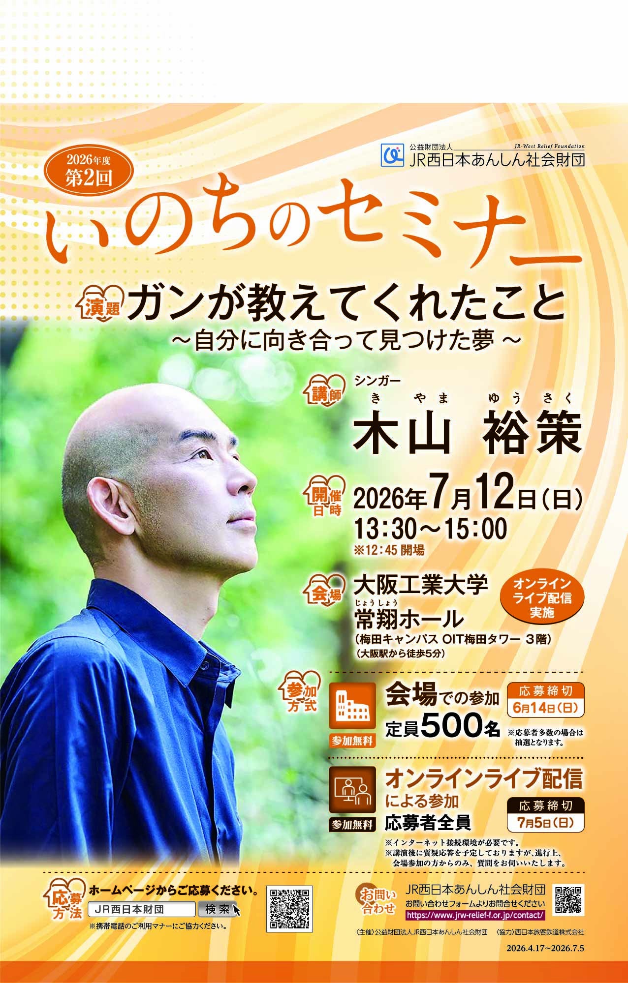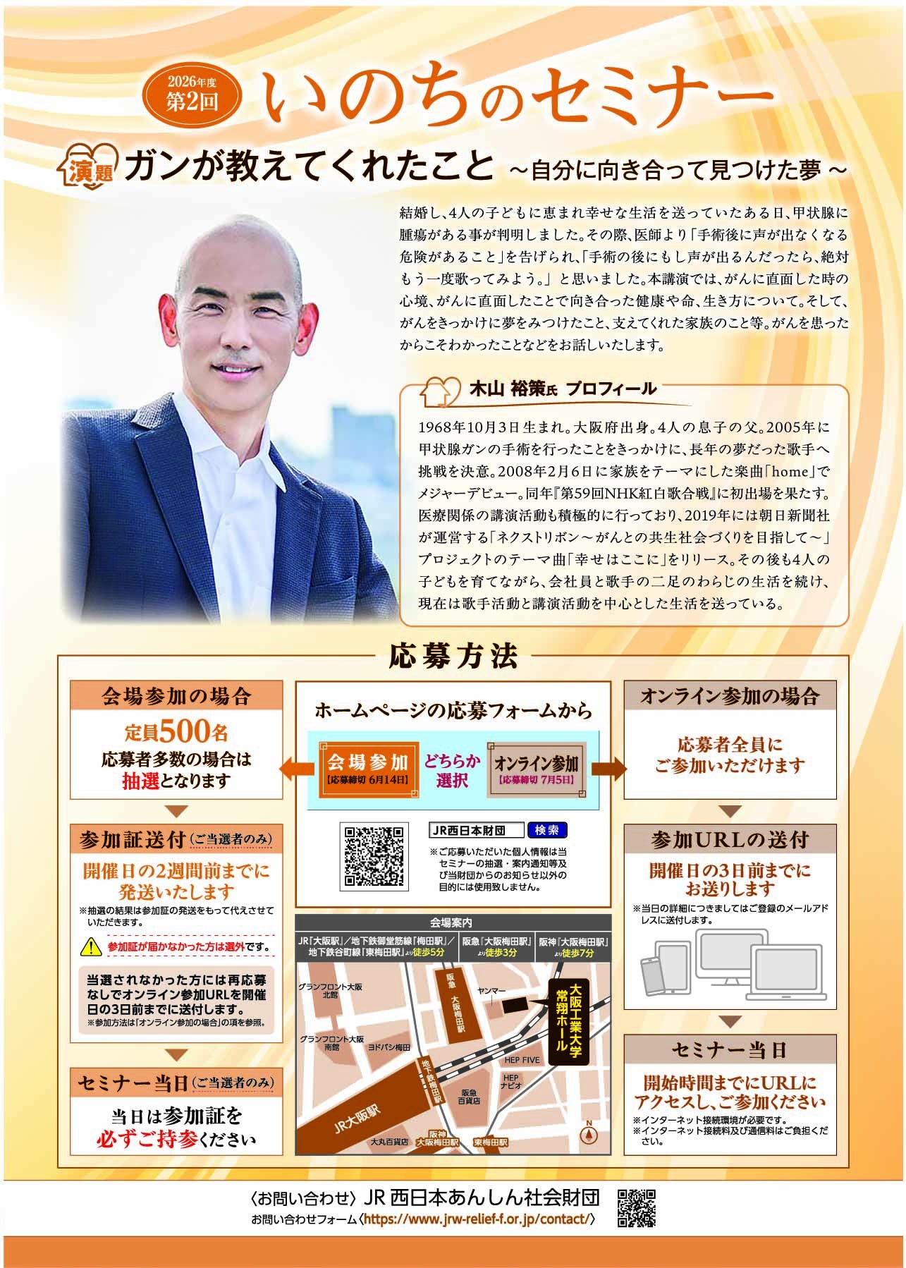 講師にはシンガーの木山裕策氏を迎え、がん闘病を乗り越えて気付いた「いのち」の大切さや困難の中でみつけた「希望」について、父親・歌手・会社員と異なる顔を持った講師の様々な経験を交えながら、人生を前向きに生きるヒント等とともにお伝えいただきます。