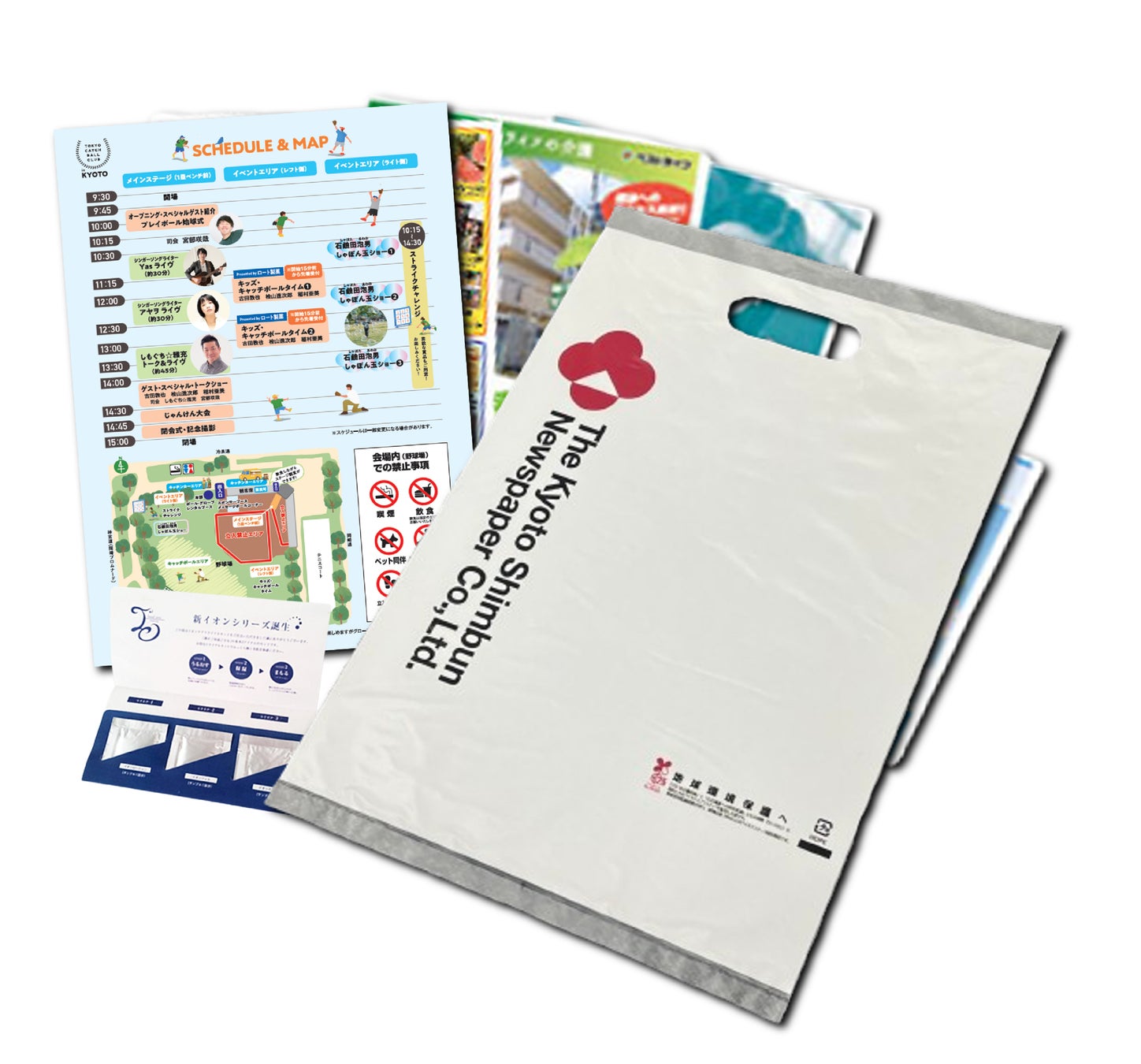 キャッチボール会場の受付にて広告物を袋に入れ、参加者へ手渡し致します。