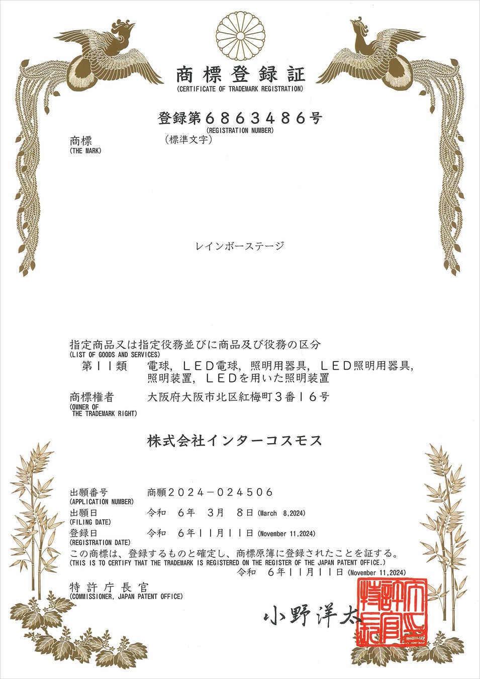 【株式会社インターコスモス】レインボーステージが特許庁にて商標登録されました!