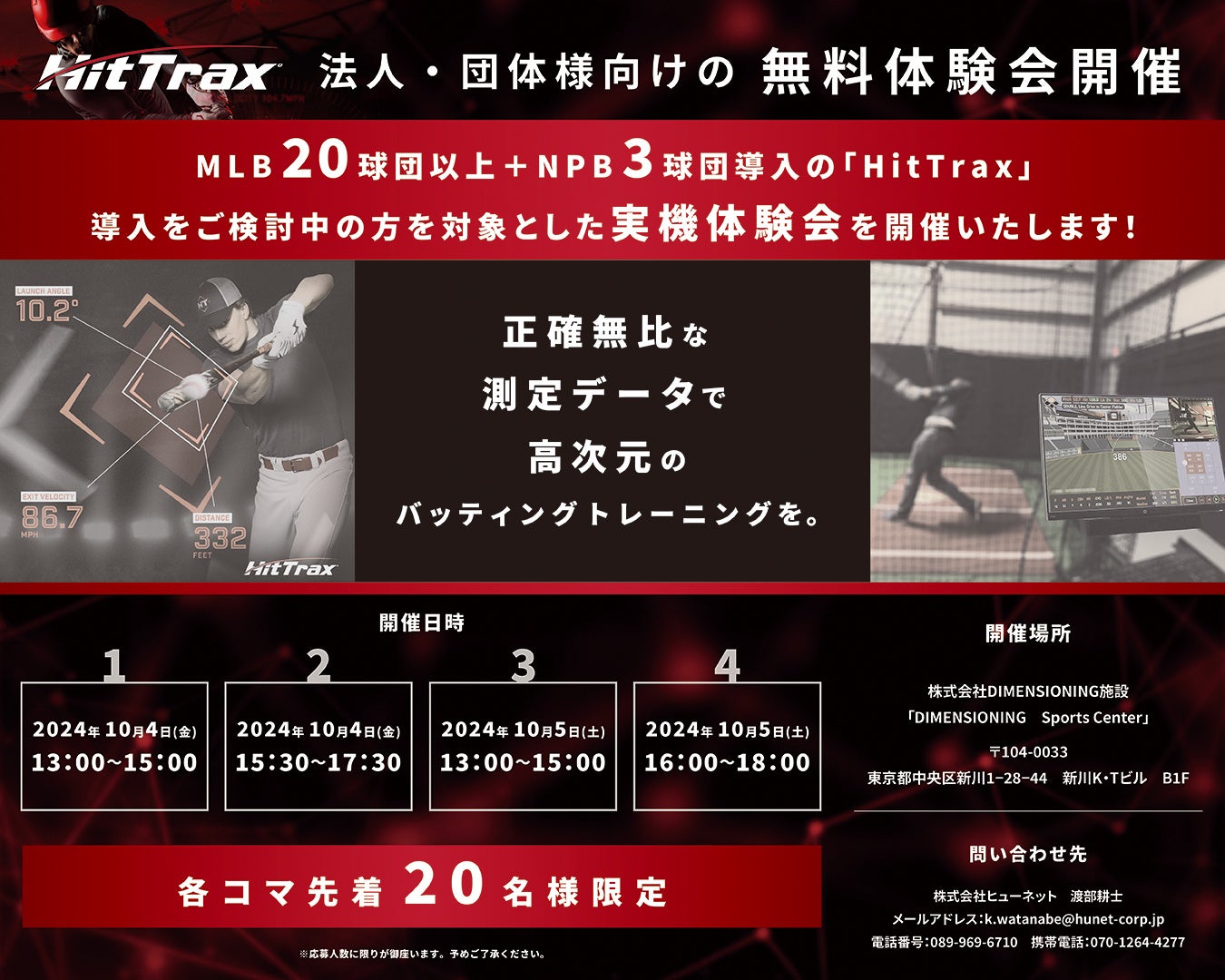 「HitTrax Pro」の実機体験会を10月4日(金)/5日(土)の2日間にわたり、東京都中央区新川「DIMENSIONING Sprots Center」にて法人・団体様向けに開催します。
