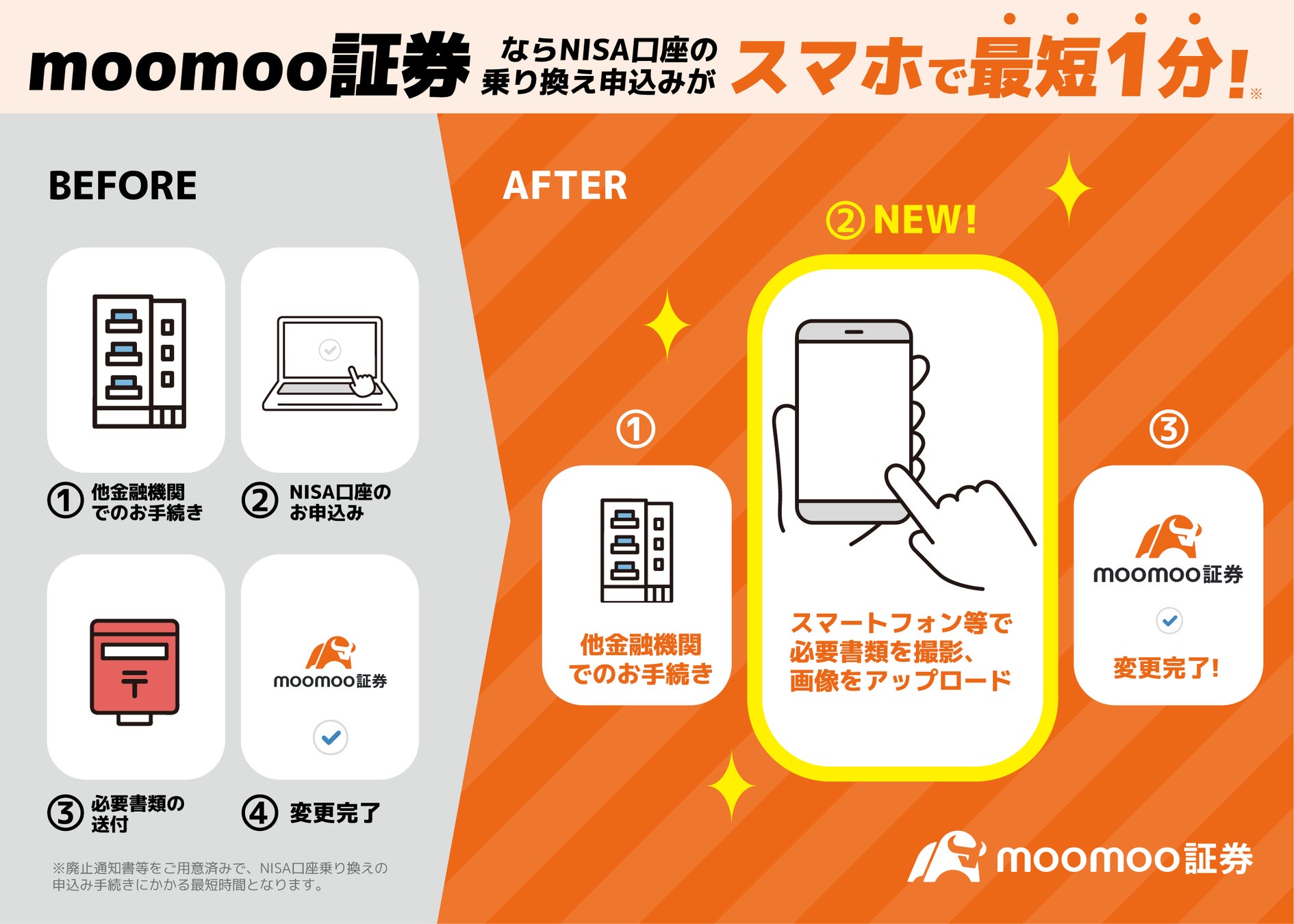 moomoo証券株式会社(ムームー、本社:東京都渋谷区、代表取締役社長:伊澤フランシスコ、以下「moomoo証券」)はこの度、ユーザー様のさらなる利便性の向上を図るため、NISA口座の金融機関変更手続きを簡略化させ、お申し込みがウェブ上で最短1分(※1)で完結できるようになったことをお知らせいたします。面倒な入力作業なしで、より簡単かつ迅速に乗り換え手続きを行うことが可能となりました。