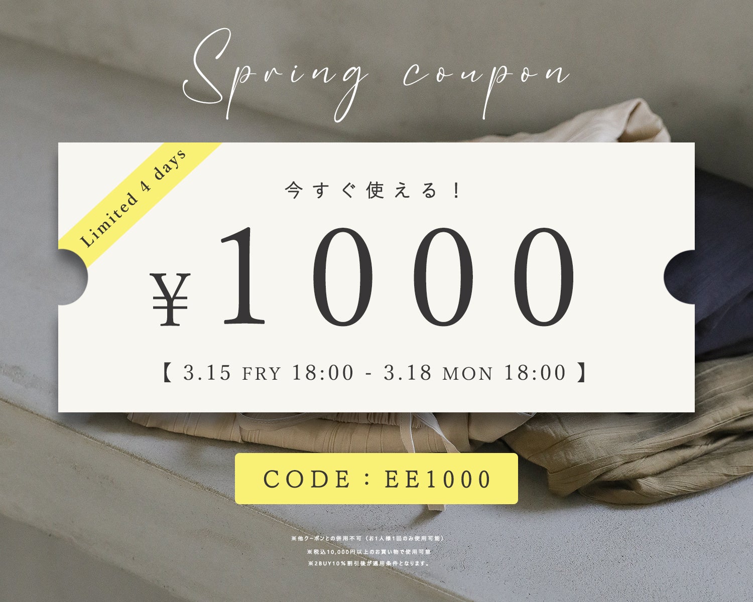 3/15(金)18:00~3/18(月)18:00までの期間中、税込10,000円以上お買い物していただいたお客様に1000円OFFクーポンをプレゼントさせていただきます。