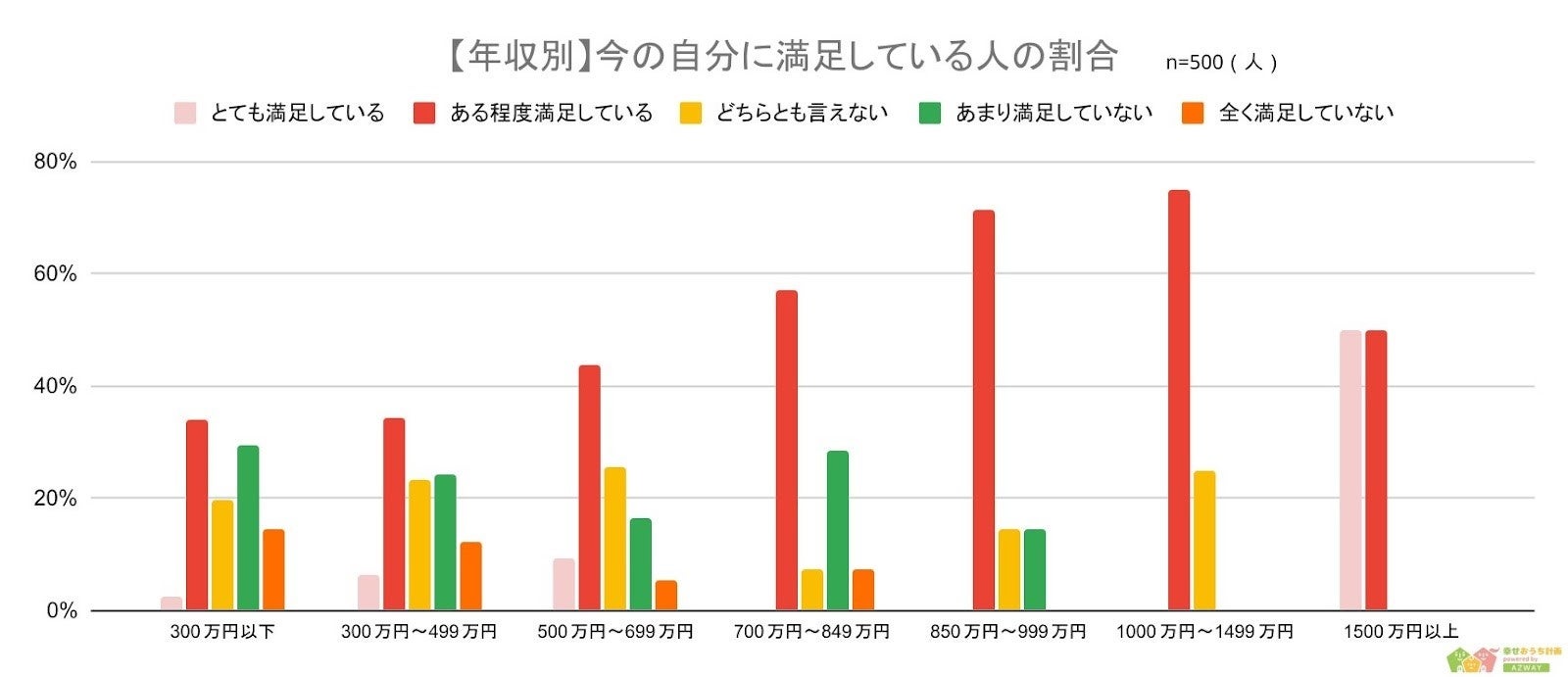 また、満足している人の割合を年収別に分析してみたところ、年収1,000万円以上の人では、満足していない人が0人という結果になりました。年収1,500万円以上の人では、「どちらとも言えない」もおらず、皆程度の差こそあれ自分の人生に満足していることがわかります。また、「全く満足していない」人の割合は、年収が高くなるほど下がっていくことがわかりました。年収は自分への満足度に大きく関わっていると言えそうです。
