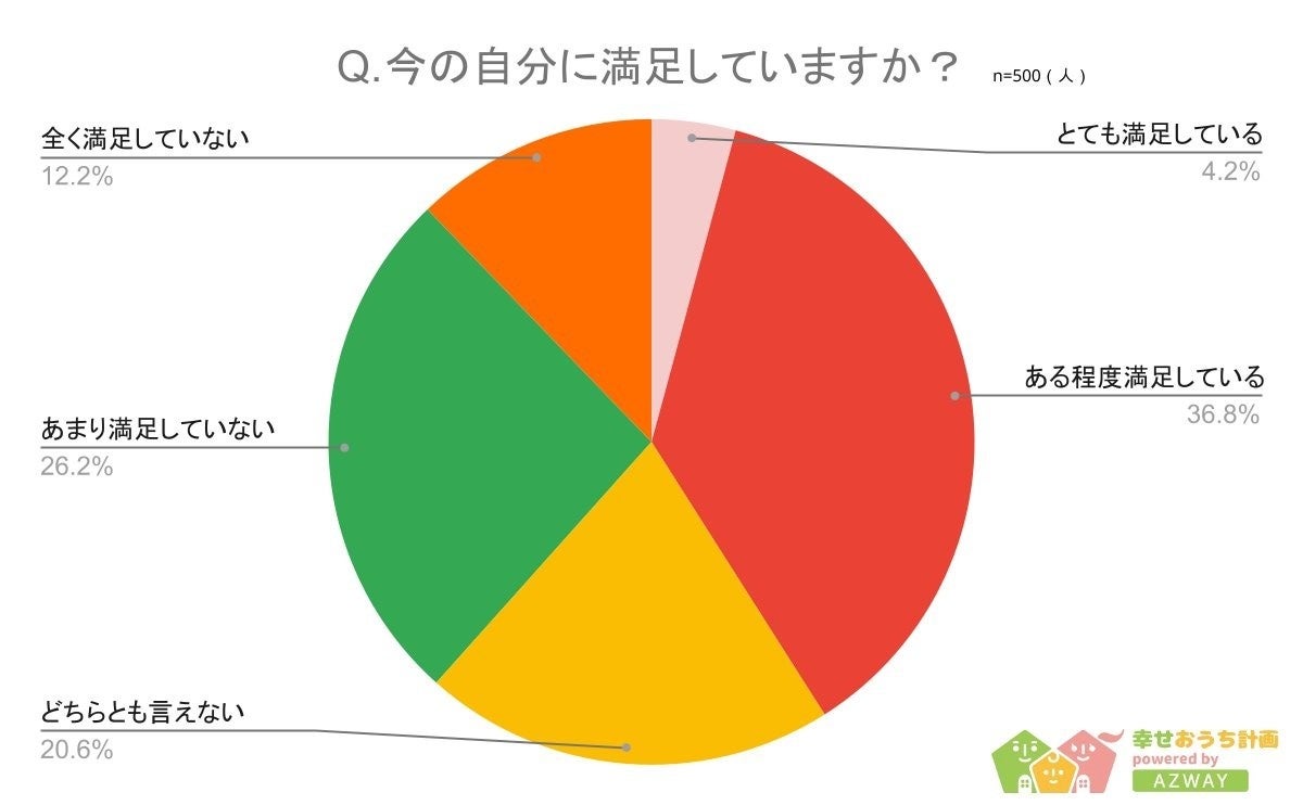 30代から70代以上までの回答者500人に「今の自分に満足しているか」について聞いたところ、「とても満足している」「ある程度満足している」と答えた人が41%、「どちらとも言えない」が20.6%、「あまり満足していない」「全く満足していない」と答えた人が38.4%という結果になりました。僅差ではありますが、満足している人の方が少しだけ多いことがわかります。