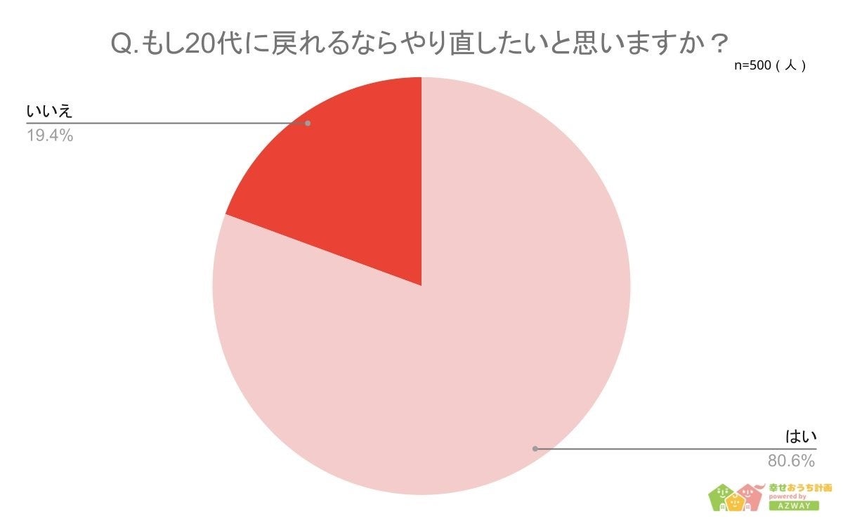 続いて、「20代に戻れるならやり直したいか」について聞いたところ、「はい」が80.6%、「いいえ」が19.4%という結果になりました。多くの人が人生をやり直したいと思っていることがわかります。