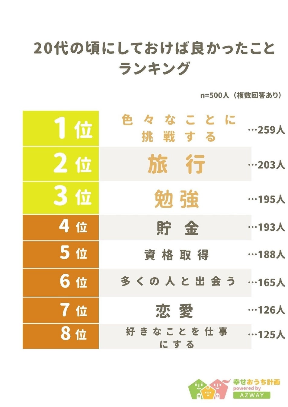 今回、株式会社AZWAY(https://azway.co.jp/)が運営する、幸せおうち計画(https://azway.co.jp/media/)は、30代から70代以上までの500人を対象に「20代にしておけば良かったこと」についてアンケート調査を実施しました。