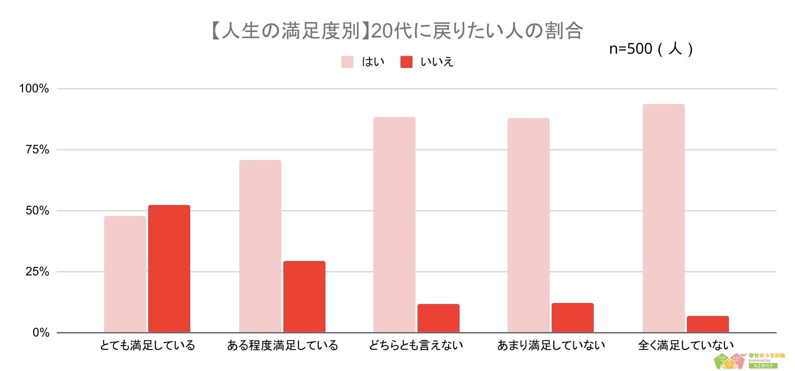 また、20代に戻りたい人の割合を「自分への満足度別」に分析したところ、満足度が下がるほど戻りたい人の割合が増えることがわかりました。ただ、今の自分に「とても満足している」と答えた人でも約半数の人が「20代に戻りたい」と回答。今の自分の人生に満足していても、全く別の可能性も見出したいと思っている人がいるとわかりました。
