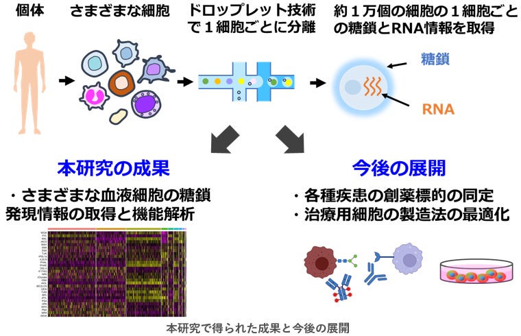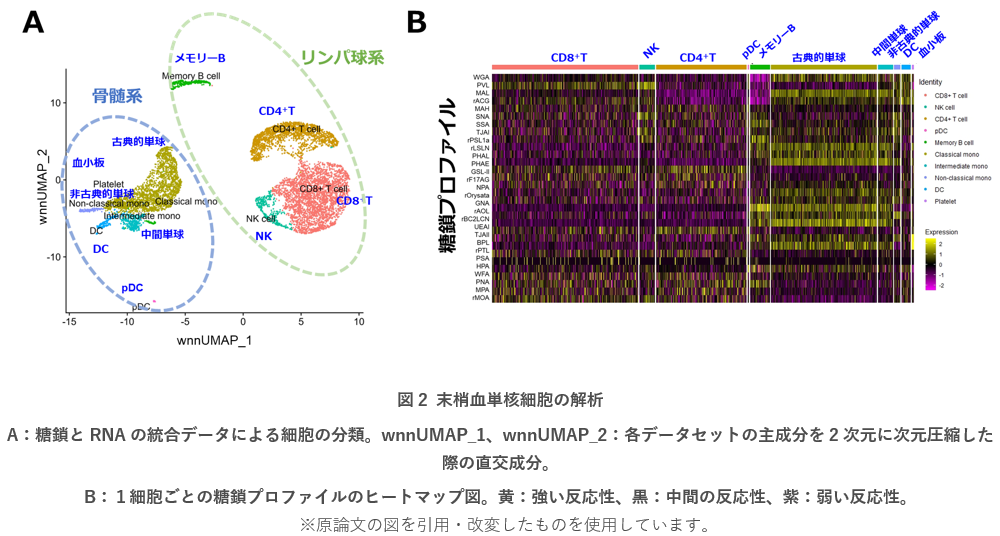このように今回開発したドロップレット型scGR-seq法を用いることで、個々の細胞の糖鎖と遺伝子の発現情報について、約1万個分を一挙に取得できるようになりました。そして、血液に含まれるさまざまな細胞型ごとの糖鎖プロファイルを取得するだけでなく、細胞型ごとに発現する特徴的な糖鎖を明らかにしました。