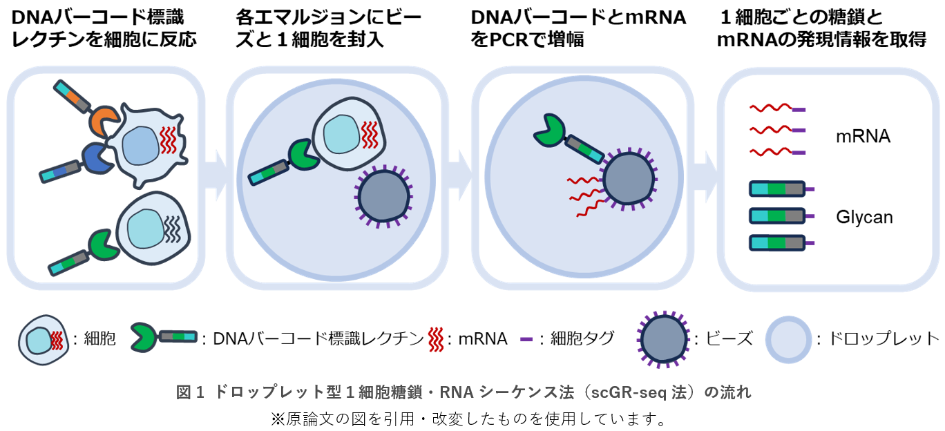 今回、ドロップレット技術を導入したscGR-seq法を考案し、1細胞ごとの糖鎖とRNAの発現データ、約1万個分を1回の実験で取得するドロップレット型scGR-seq法の開発に至りました。図1に実験の流れを示します。さまざまな糖結合特異性を有する30種のレクチンを選抜し、それぞれに固有の短い塩基配列の目印(DNAバーコード)を結合させたDNAバーコード標識レクチンを作製しました。そしてドロップレット技術を用いて、マイクロ流路により1個のエマルジョンに1個の細胞と1個のビーズを封入しました。ビーズには異なるDNAバーコードが細胞の目印(細胞タグ)として含まれており、それぞれの細胞で得られる情報を識別できるようにしてあります。細胞タグには、レクチンに修飾されているDNAバーコードとmRNAに結合する塩基配列が含まれています。細胞タグが結合したDNAバーコードとmRNAの情報をPCR(ポリメラーゼ連鎖反応)で増幅することで、1個の細胞に結合したレクチンの種類と相対分子数、およびmRNAを次世代シーケンサーで解析しました。これにより1細胞ごとの糖鎖と遺伝子の発現情報を同時に取得しました。
