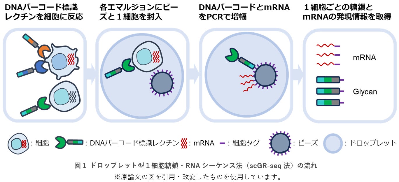 国立研究開発法人 産業技術総合研究所(以下「産総研」という)細胞分子工学研究部門 多細胞システム制御研究グループ 舘野浩章 研究グループ長と、筑波大学大学院ヒューマンバイオロジー学位プログラム(博士)大学院生 Sunanda Keishamさんは、組織などから分離した約1万個の細胞の1個1個に発現する糖鎖とRNAを次世代シーケンサーで一斉解析するドロップレット型1細胞糖鎖・RNAシーケンス法(ドロップレット型scGR-seq法)を開発しました。
