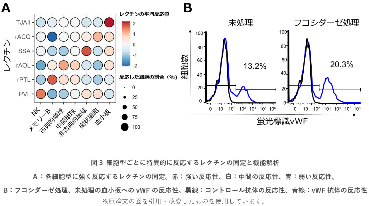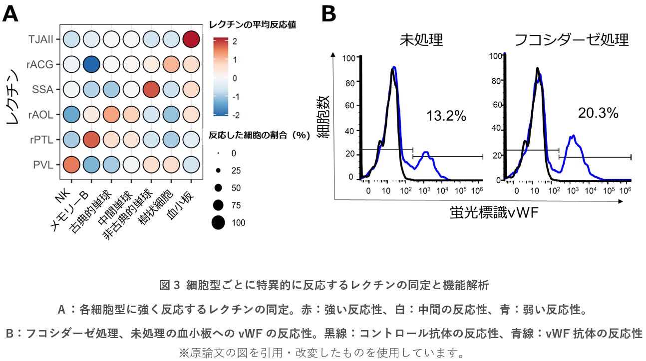 次に、それぞれの細胞型に特異的に反応するレクチンを探索しました(図3A)。TJAIIと呼ばれるa1,2フコース特異的レクチンは、他の細胞型と比べて血小板に強く反応しました。細胞を解析するための一般的な手法であるフローサイトメトリー法でも同様の結果が得られました。TJAIIが血小板上のどのような糖タンパク質に反応しているのかについて調べたところ、GPIbaという血小板特異的な糖タンパク質に強く反応することがわかりました。GPIbaは障害を受けた血管壁に集積したフォンビルブランド因子(vWF)と結合することで血液凝固を引き起こすことが知られています。血小板上のa1,2フコースをフコシダーゼと呼ばれる糖加水分解酵素で除去すると、vWFへの反応性(蛍光強度)が高い血小板の割合が13.2%から20.3%に増加しました(図3B)。すなわち血小板上のa1,2フコースは血液凝固において重要な役割をもつことが示唆されました。