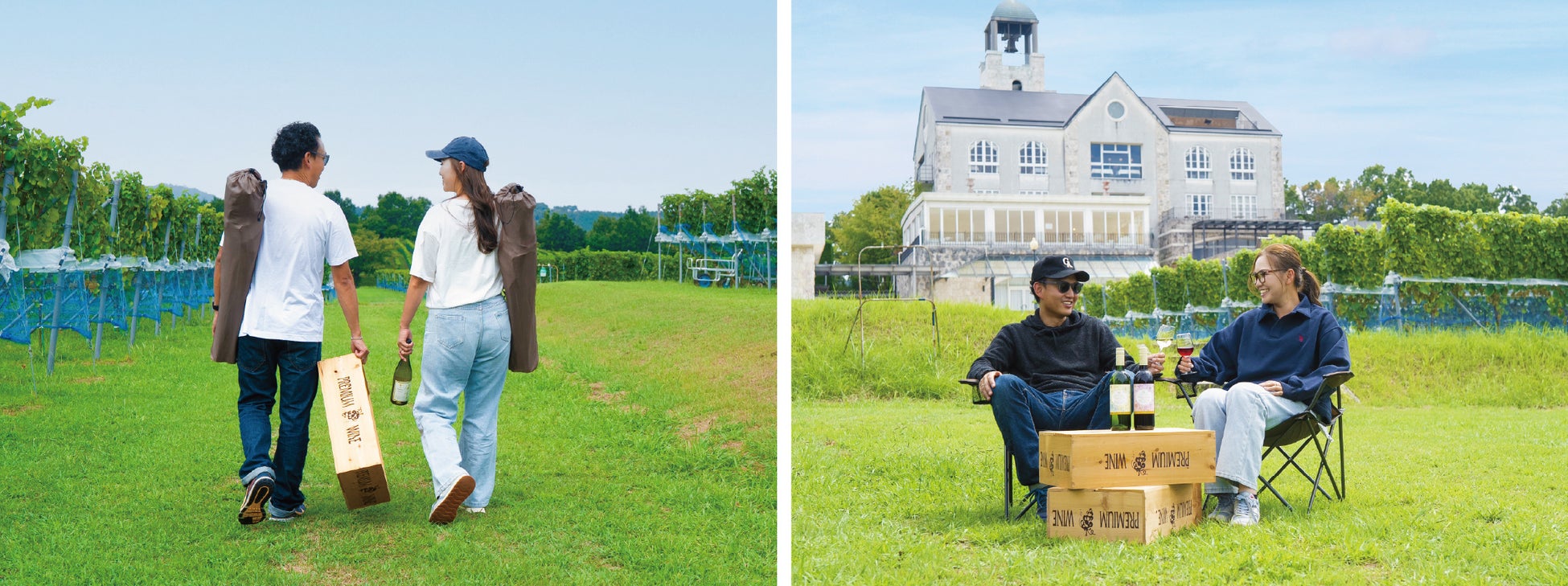 栽培スタッフおすすめの景色が楽しめる畑の中で、のんびりゆったり秋風を感じながら、ワインやコーヒーをお楽しみいただきます。