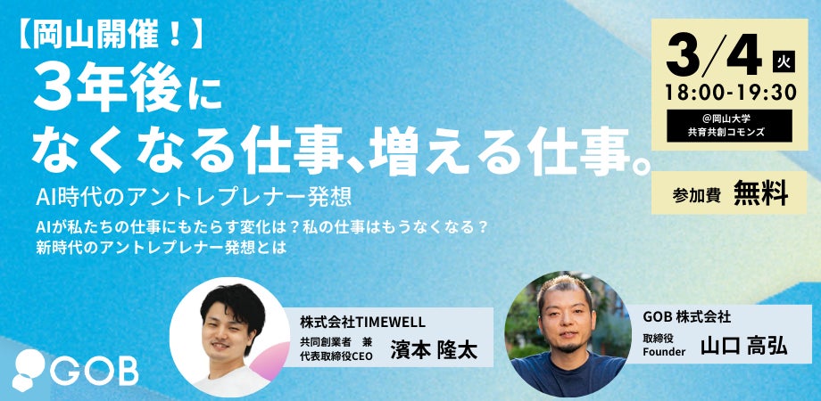 株式会社TIMEWELL(本社:神奈川県横浜市、代表取締役:濱本隆太、以下「TIMEWELL」)は、GOB株式会社(本社:東京都渋谷区、代表取締役社長CEO:高岡泰仁、以下「GOB」)とともにトークイベント「3年後になくなる仕事、増える仕事~AI時代のアントレプレナー発想~」を2025年3月4日に開催することをお知らせします。