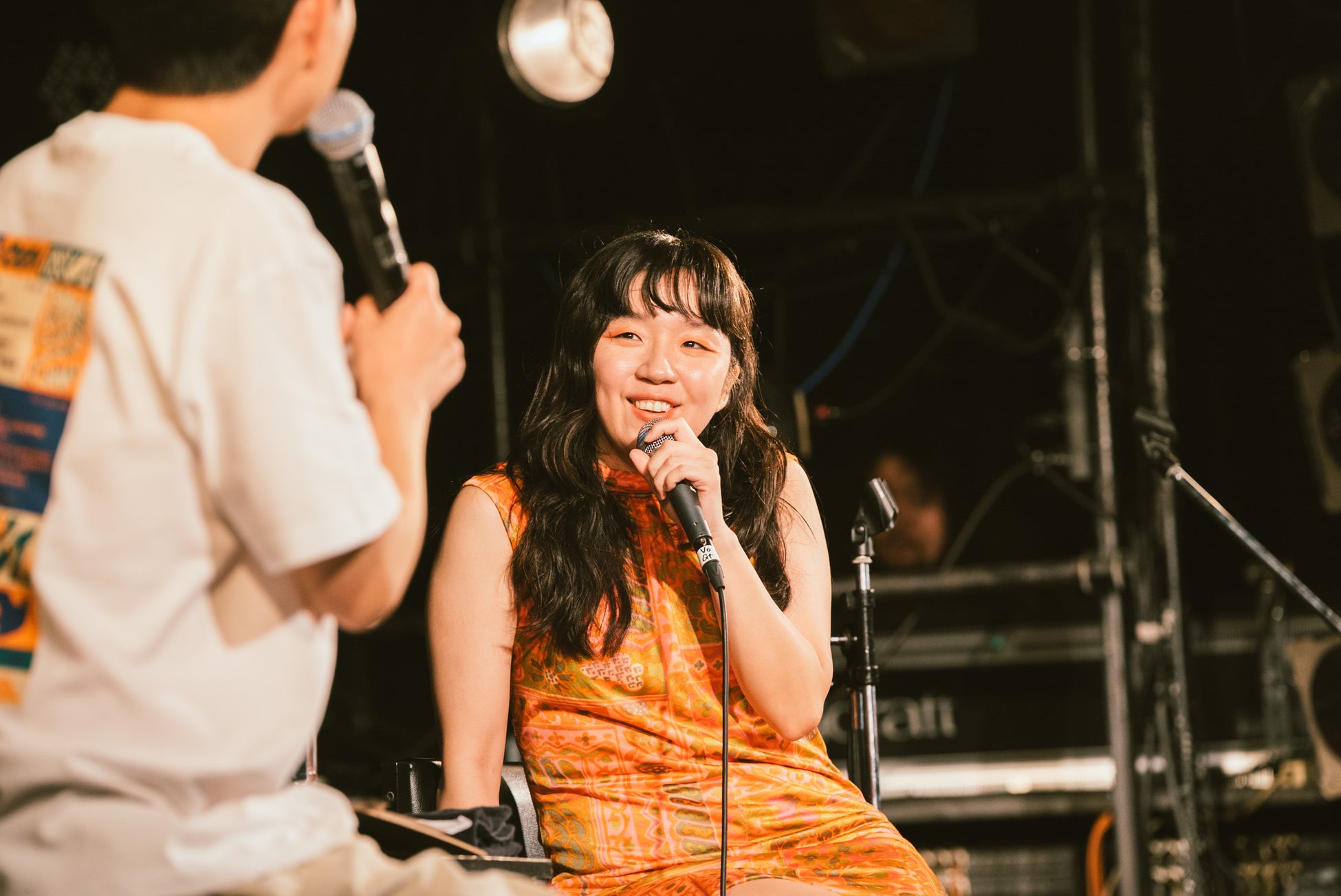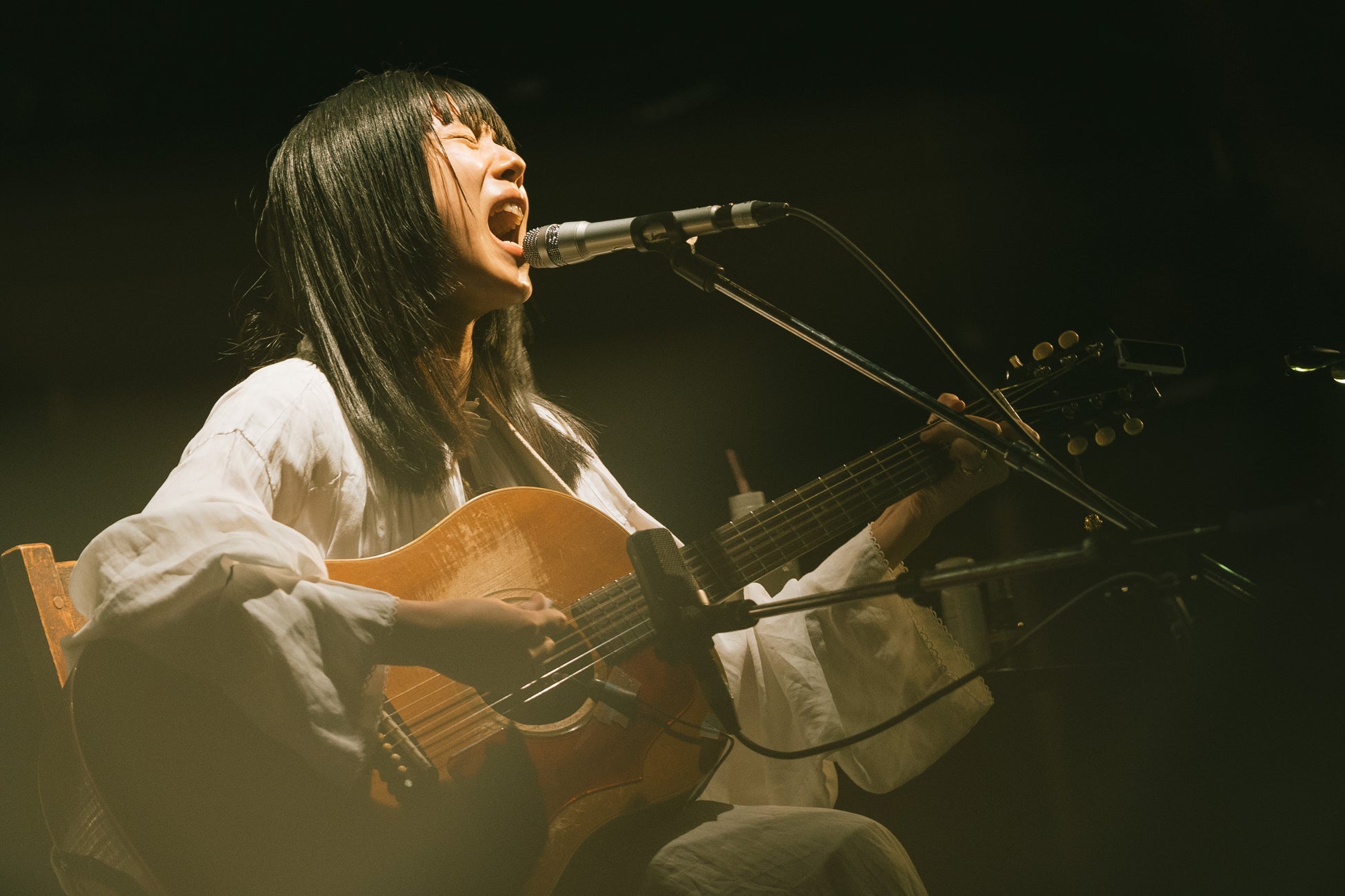 最後の曲 「気分」 では、轟音と共に魂のこもった歌声を響かせた。その音は弾き語りでありながらも、彼女のバンドセットを彷彿とさせるものだった。