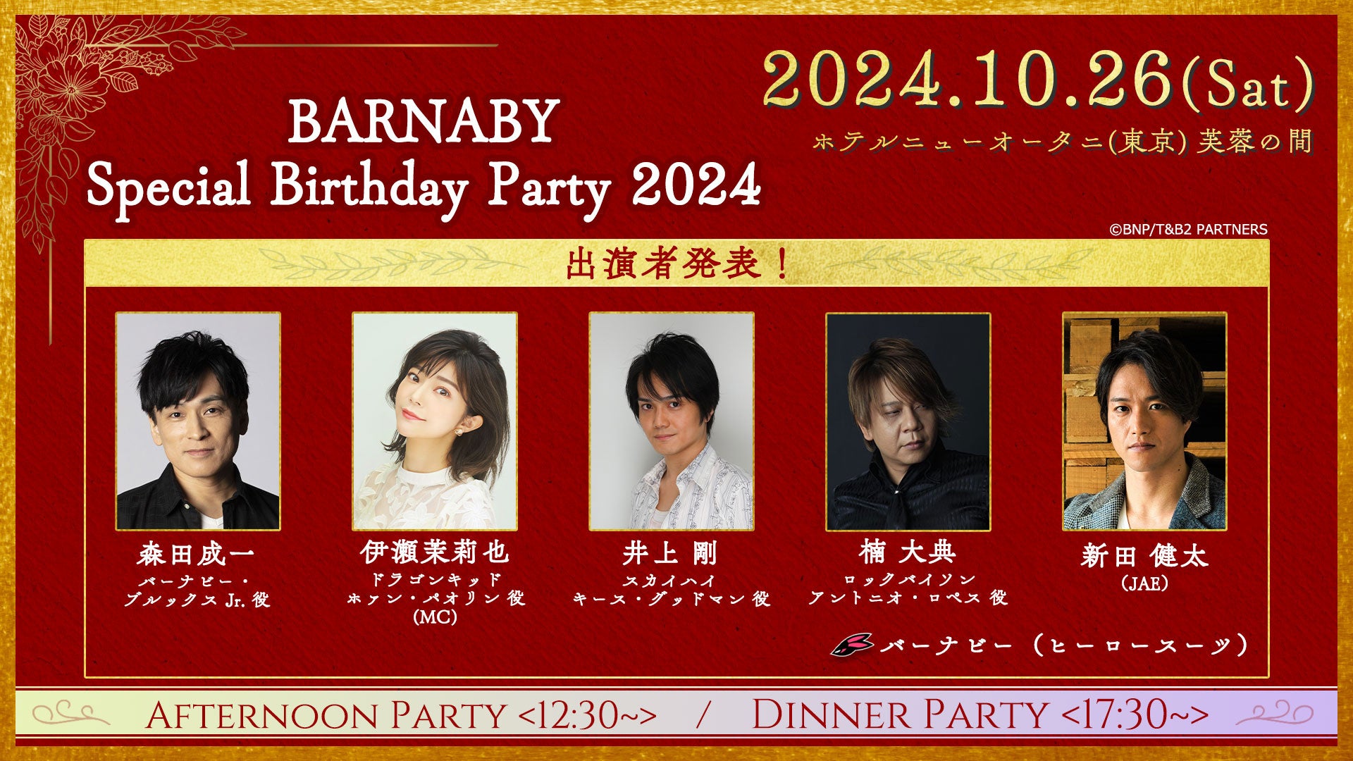「ワイルドタイガー」に続き、2024年10月26日(土)にホテルニューオータニ(東京) 芙蓉の間 にて、「BARNABY Special Birthday Party 2024」の開催が決定いたしました。出演者は森田成一さん(バーナビー・ブルックス Jr.役)、伊瀬茉莉也さん(ドラゴンキッド/ホァン・パオリン役)、井上 剛さん(スカイハイ/キース・グッドマン役)、楠 大典さん(ロックバイソン/アントニオ・ロペス役)、スーツアクターの新田健太さんを迎えることも発表されました。