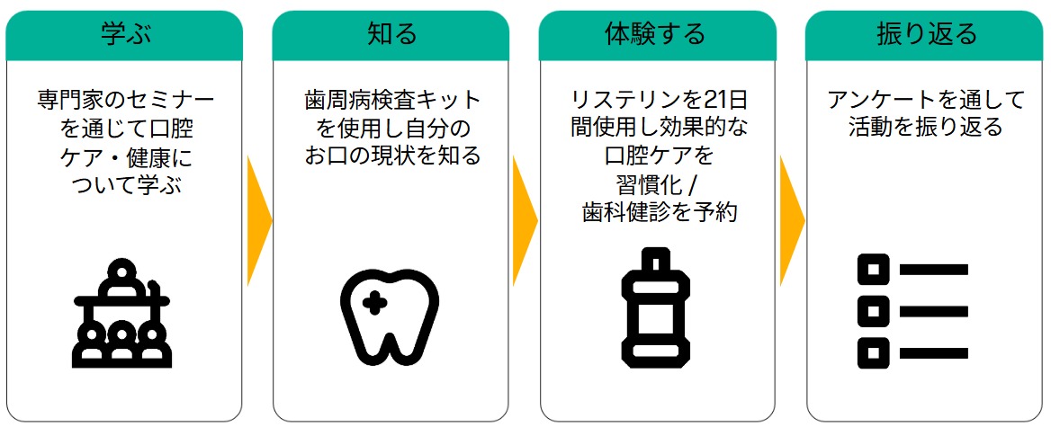 日本で売上No.1*¹の薬用マウスウォッシュ「リステリン®」を展開するKenvue(ケンビュー)は、社員の口腔ケア習慣の定着と健康意識の向上を目的に、「21日間マウスウォッシュチャレンジ」を社内で実施しました。新しい習慣が定着するために必要な期間は21日間であると言われており、今回の企画もその考えを採用しています。このチャレンジは、Kenvueが掲げる「日々のケアがもたらす驚くべき力を解き放つ」というパーパスのもと、社員一人ひとりが自分の健康と向き合い、日々のケアによるポジティブな変化を体験する活動として開始されました。