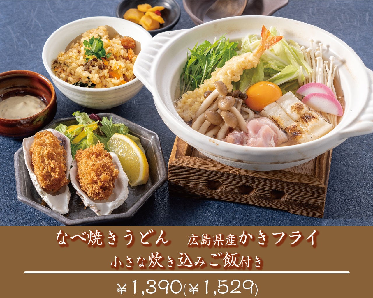 お出汁と野菜の旨味が溶け出したあっつあつのなべ焼うどんと、揚げたての広島県産カキフライをはじめ、自家製お出汁で炊き上げた炊き込みご飯、をセットにし、多彩なメニューを一度にお楽しみいただけます。