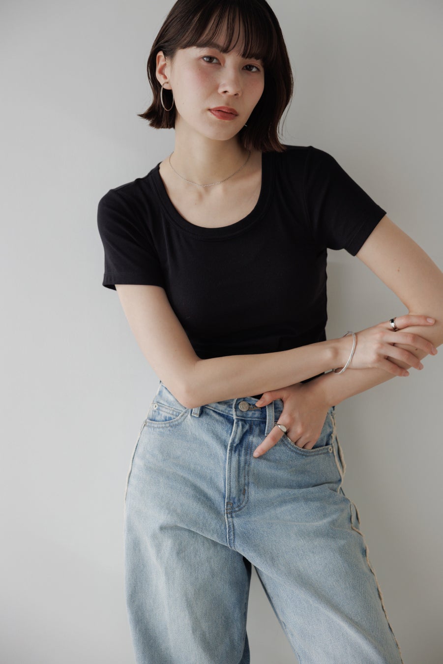 絶妙な開きのクルーネック仕様で顔周りをすっきり見せ。フィットするサイズ感のため生地が浮きづらく、バックスタイルもきれい見せを実現しました。