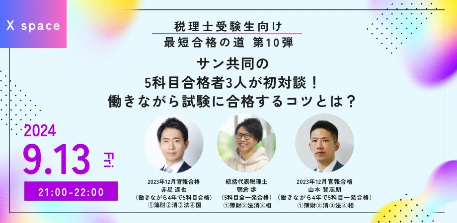 サン共同税理士法人(本社:東京都港区、代表社員: 朝倉 歩)は、 2024年9月13日(金)21:00より「税理士試験 最短合格の道」と題し、最短で試験に合格する勉強方法やモチベーション維持方法などをX(旧Twitter)スペースにてお伝えいたします。今回は、東京青山オフィスのマネージャー 山本 賢志朗と大阪オフィスのマネージャー 赤星 達也(税理士)とともに、働きながら税理士試験に合格するポイントをお伝えします。