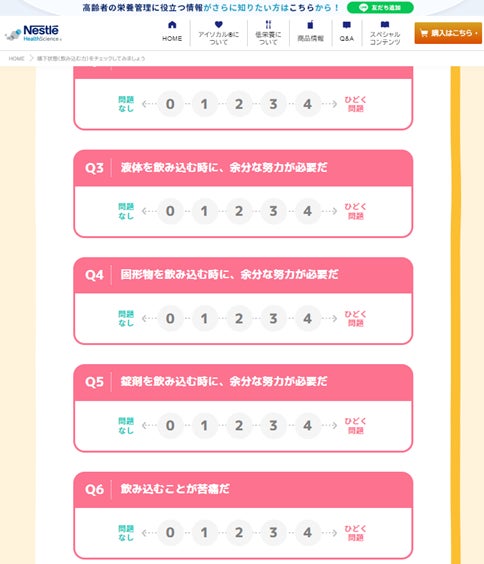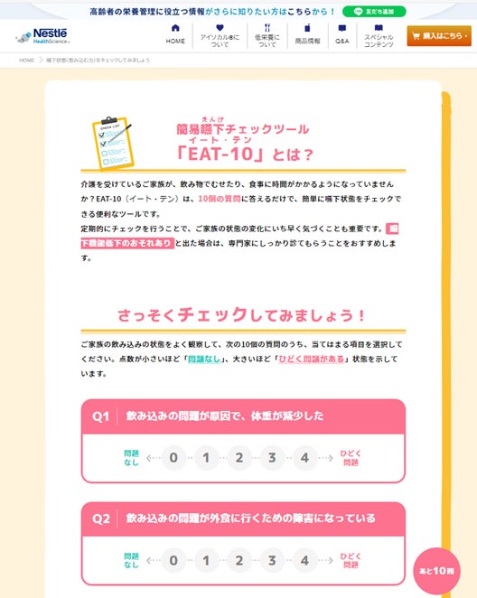 ネスレ ヘルスサイエンスは、10個の質問に答えるだけで、簡単にえん下状態をチェックできる簡易えん下チェックツール「EAT-10(イート・テン)」をホームページで公開しています。飲み物でむせたり、食事に時間がかかるようになっていないか、定期的にチェックを行うことで、えん下状態の変化にいち早く気づくことも可能になります。