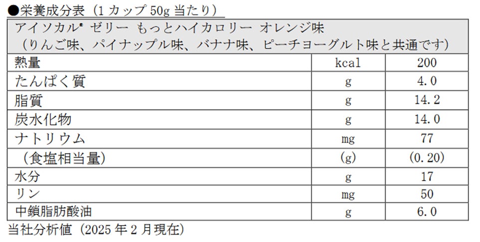 「アイソカル ゼリー もっとハイカロリー」は、少量で高カロリーを摂取できる経口栄養補助食品で、特別用途食品のうち、「えん下困難者用食品」の許可基準Ⅱの表示許可を取得しています。これまでのりんご味、パイナップル味、バナナ味、ピーチヨーグルト味に、今回新たに【オレンジ味】が加わり、全5フレーバーの展開になりました。