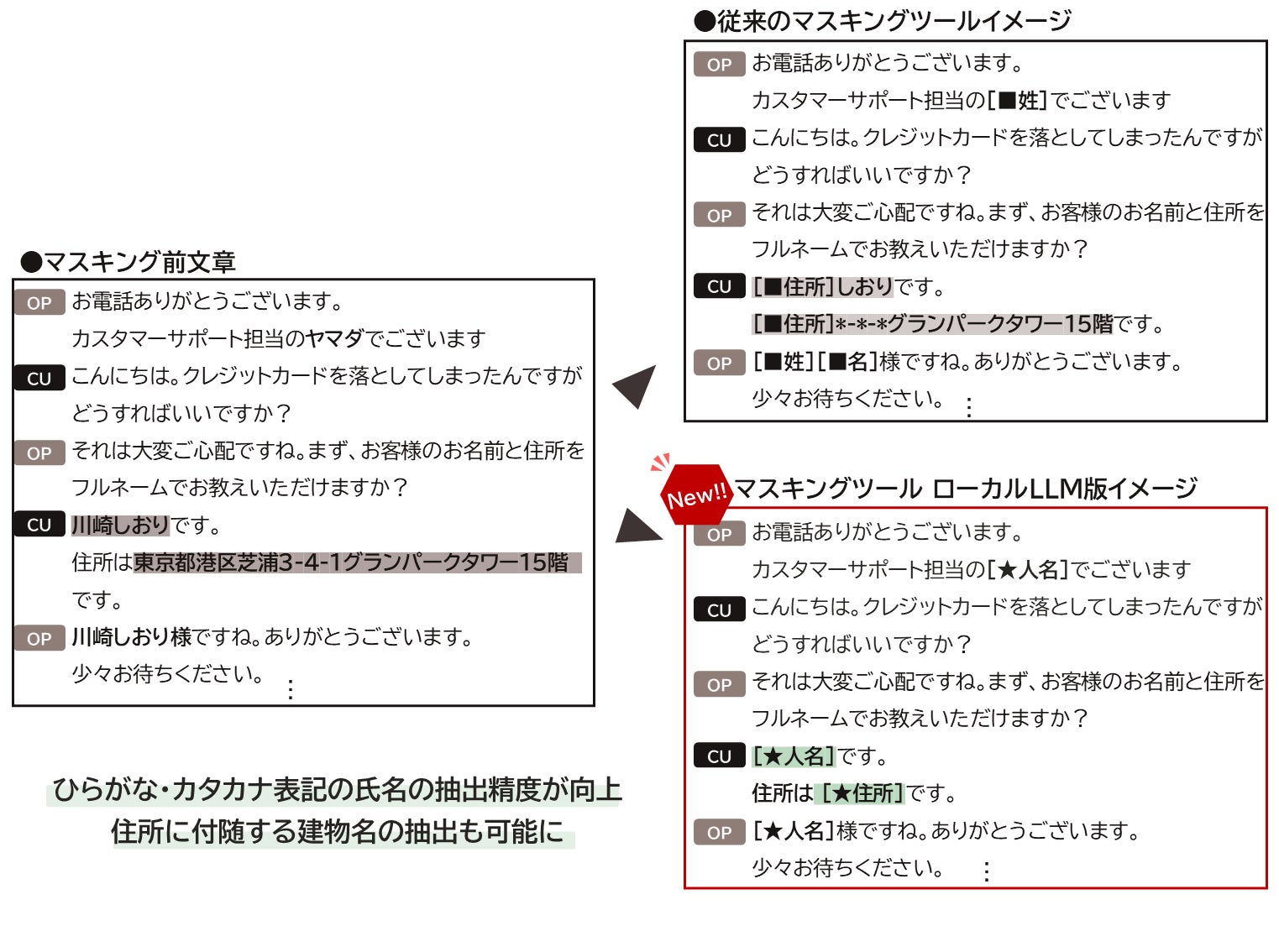 そのような中、データの匿名加工と、マスキングの両方が行える匿名加工情報作成ソフトウェア「tasokarena」は、新たにローカルLLM(*2)を用いてマスキング対象の抽出向上を実現した、マスキングツール ローカルLLM版の提供を開始します。テキストマスキングにローカルLLMを活用することで、漢字、ひらがな、カタカナが混在する日本語の特性を考慮した文脈理解による個人情報の抽出率が大幅に向上しました。より高い精度でマスキングすることが可能となり、マスキングされたデータの目視確認や修正対応の負担を軽減できます。さらに、ローカルLLMを用いることで、外部ネットワークに接続することなくマスキングを行うことができ、機密情報の漏洩リスクを低減します。