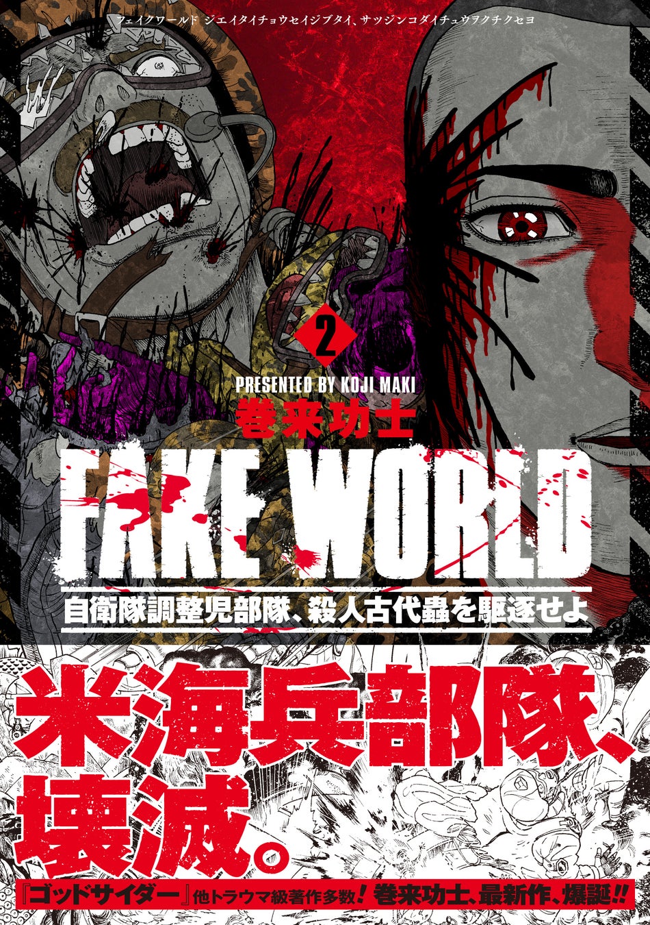 巻来功士最新作『FAKE WORLD 自衛隊調整児部隊、殺人古代蟲を駆逐せよ』第1巻、第2巻が