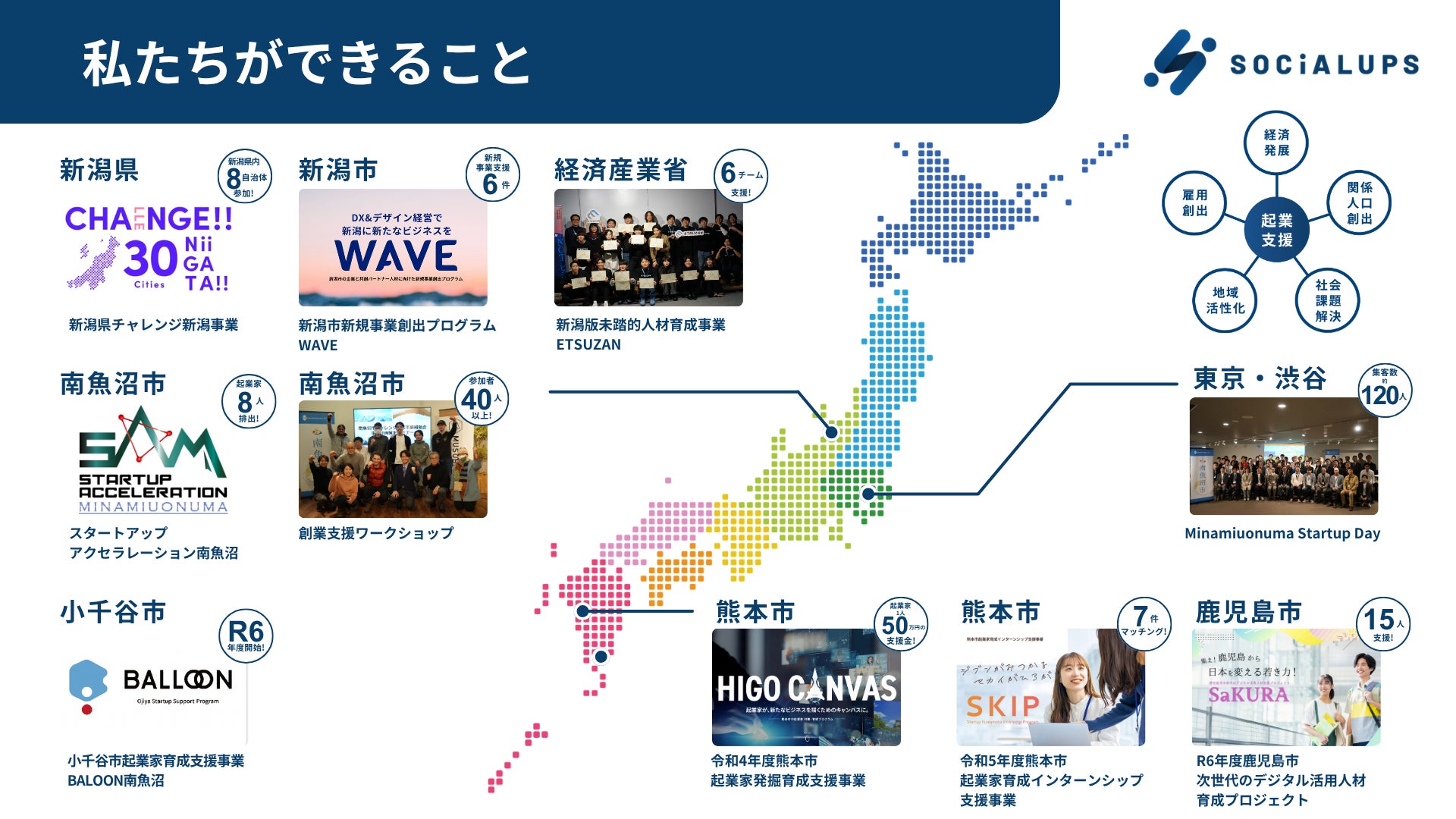 この思いから、スタートアップ推進事業をベースとした各都市の支援体制の構築、スタートアップ支援、起業家の育成など事業展開をしています。