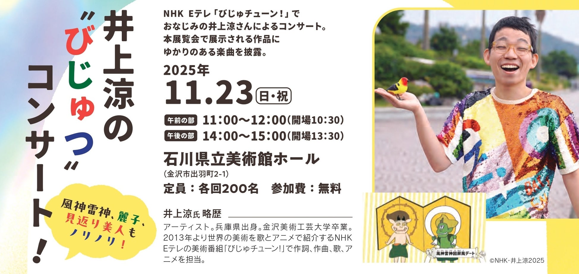 NHK Eテレ「びじゅチューン!」でおなじみの井上涼さんによるコンサートです。本展覧会で展示される作品にゆかりのある楽曲を披露します。