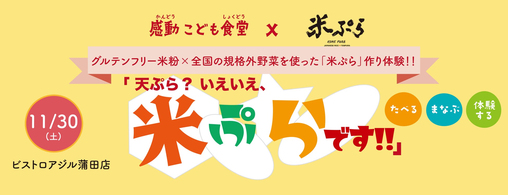 一般社団法人感動こども協会は(株)IZMと協働で、グルテンフリー米粉×全国の規格外野菜を使った「米ぷら」作り体験を2024年11月30日(土)に感動こども食堂「ビストロアジル蒲田店」にて開催しました。