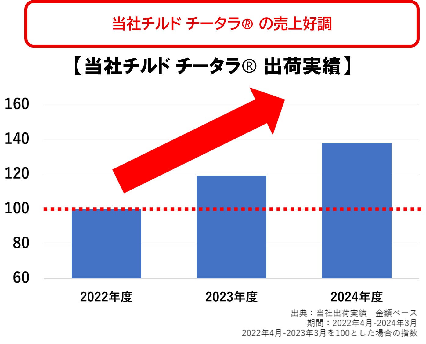 当社のチルドタイプチーズ「なめらか チータラⓇ」は、なめらかな食感が特長の商品で、主に40代以上の女性から支持をいただいています。人気のキャラクターや人気のスナック菓子、調味料とのコラボレーションを継続的に続けており、2024年度においても、2022年度対比で2桁伸長をしております。