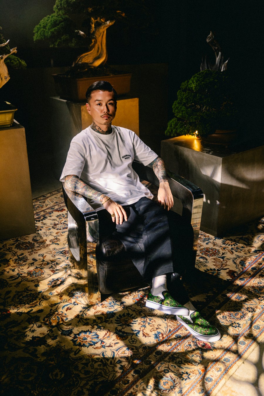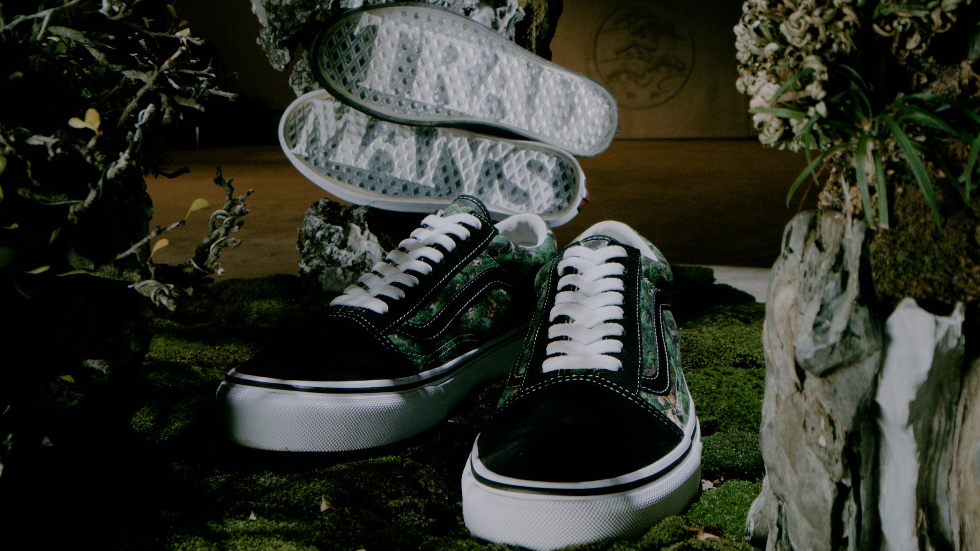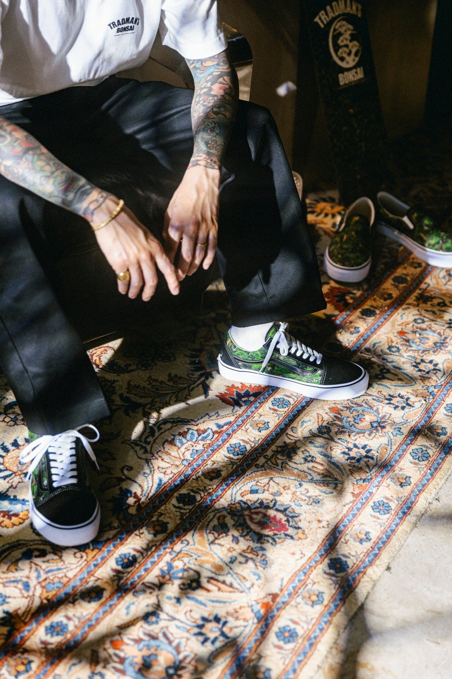 OLD SKOOLは、サイドパネルからインソール、アウトソールまでBONSAI CAMOUFLAGEを贅沢に配置し、左右で異なるTRADMAN’S BONSAIロゴの刺繍とブラック×レッドのヒールパッチを採用。