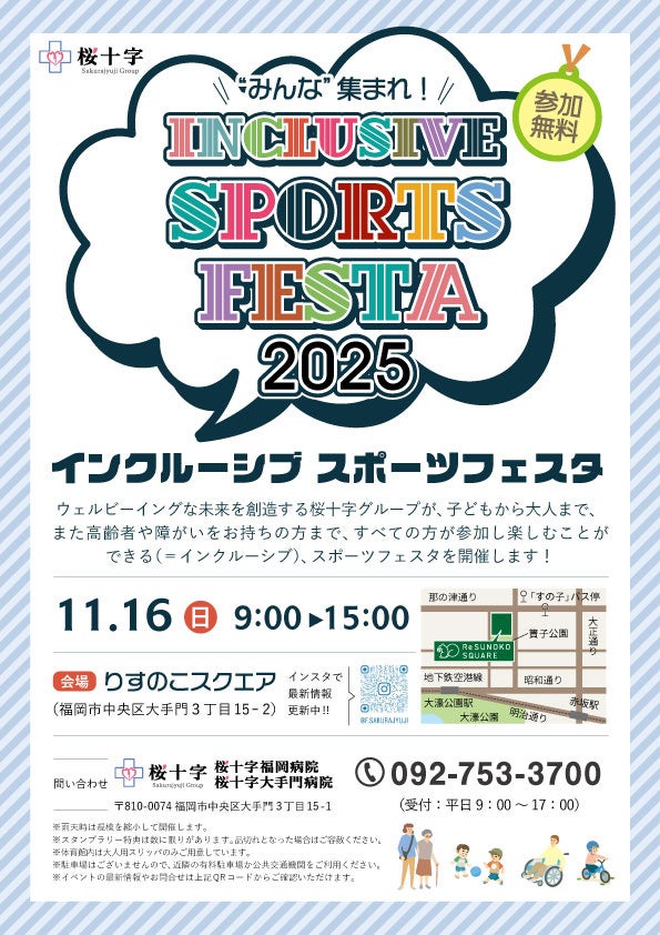 その一環として、子どもから大人まで、また高齢者や障がいをお持ちの方まで、誰もが楽しめる「桜十字インクルーシブ スポーツフェスタ2025」を、昨年に引き続き、りすのこスクエア(福岡市中央区)にて、2025年11月16日(日)9:00~15:00にて開催いたします。