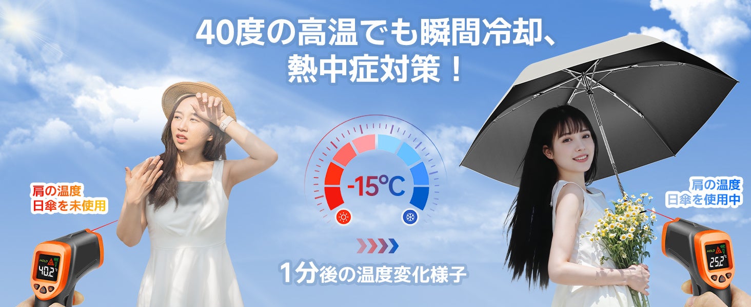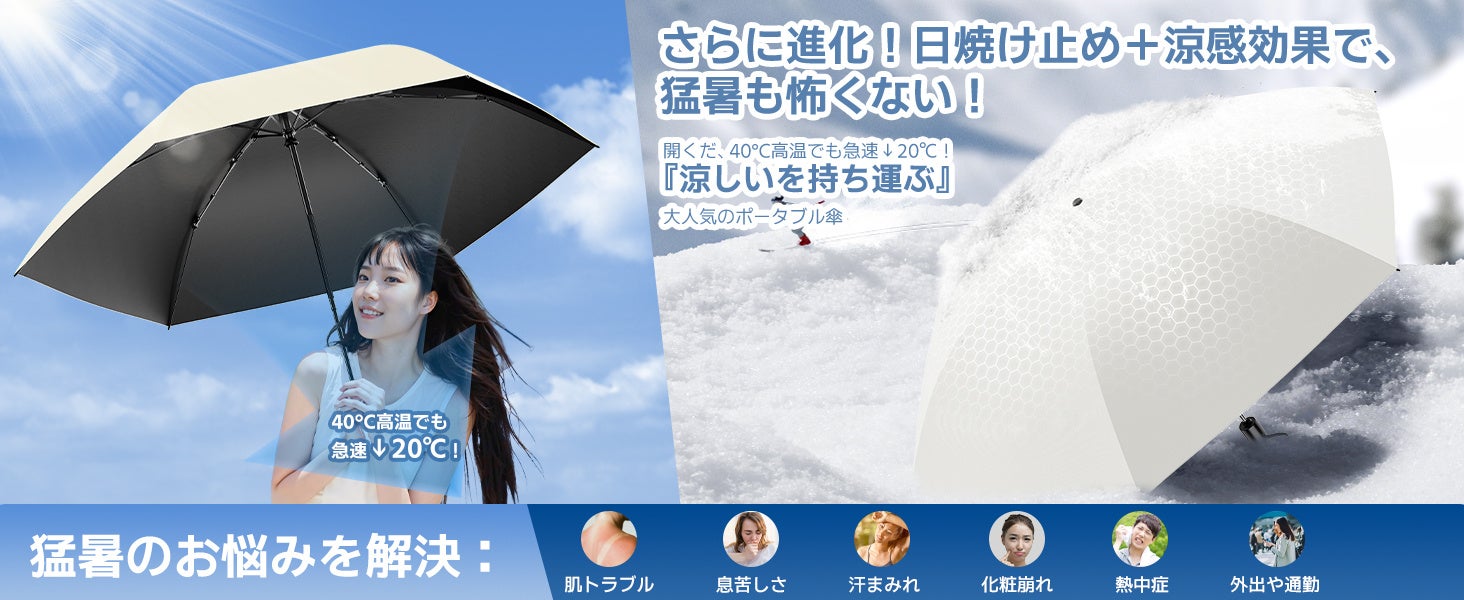 紫外線対策だけでなく、Alwgreenの折りたたみ日傘は酷暑にも対応する驚きの冷感効果を提供します。ドイツから輸入した特許技術のアイスシルク素材を採用しており、開くとすぐに20度の冷却効果が感じられ、最高40度の暑さでも「涼しい木陰」のような心地よさを提供します。この機能は、外出や通勤時の汗の問題を解決し、熱中症の予防にも最適です。