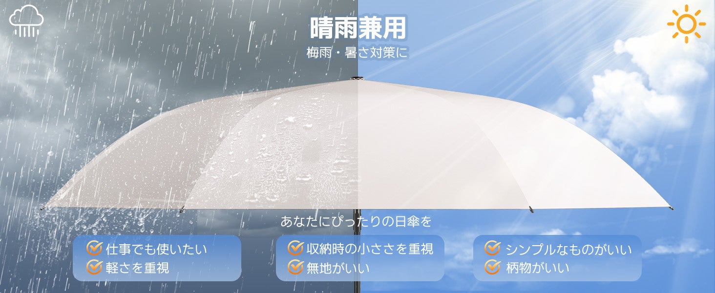Alwgreenのこの日傘は、わずか200グラムで、先進的なガラス繊維とアルミ合金フレームを採用し、軽量かつ頑丈です。厚さ3センチのスリムなデザインで、ポケットに収まるほど小さく、通勤、ショッピング、旅行など、どんなシーンでも持ち運びに便利です。また、直径97センチの傘面は一般的な日傘兼用雨傘よりも広く、晴雨兼用で二人でも快適に使用できます。