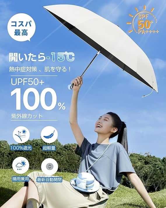 Alwgreenの日傘は、紫外線対策に加え、100%遮光遮熱機能を備えています。大きめサイズで超軽量設計、耐風性が高く、レディース、メンズ、子供、大人兼用で、収納ポーチ付きです。晴雨兼用で超撥水機能があり、熱中症対策や日焼け止め対策に最適です。ドイツ製の高品質な傘生地を使用し、完全な遮光・遮熱、UV0効果を実現。開いた瞬間から-15℃の冷却効果があり、厳しい暑さから身体を守ります。安全式自動開閉機能を備え、省力80%で小学1年生でも簡単に扱え、10万回の開閉テストをクリアし、最長10年間使用可能です。軽量でコンパクト、収納時の厚みはわずか3.5cmでポケットに収納可能。重さは約230gで、通勤、通学、旅行、スポーツなどあらゆるシーンで利用できます。晴雨兼用で大きく実用的、310Tの高密度防水層により雨水を瞬時に阻止し、乾かしやすく収納しやすいです。強風に耐えられ、コンパクトで耐久性も優れています。詳細は以下のリンクからご覧ください:https://www.amazon.co.jp/gp/product/B0D45Q5NK6