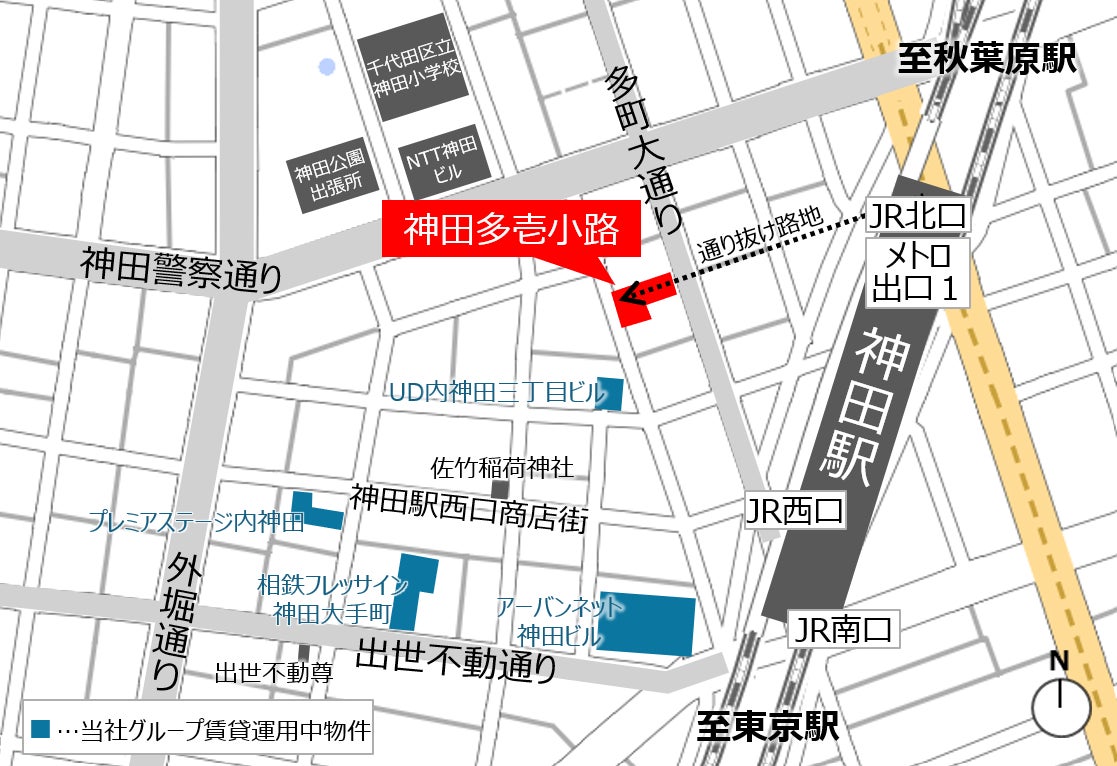 本物件はJR神田駅から徒歩2分、飲食店が立ち並ぶ味わいのある路地空間が広がるエリアに位置しており、周辺は秋田佐竹藩とゆかりのある佐竹稲荷神社や出世不動尊など、神田らしさや歴史を感じられる空間も多数存在する由緒ある下町となっています。