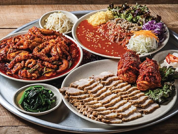 韓国で300店舗展開している大人気韓国料理店が日本初出店! 売りは、「テナガタコの直火炒め、ポッサム(茹で豚)、マッククス(韓国風まぜそば)」がセットになった「オボンスペシャル(左写真)」です。 韓国では、ドラマ、芸能、ユーチューブなど多くのメディアに紹介されています。本場韓国の味をお楽しみ下さい。
