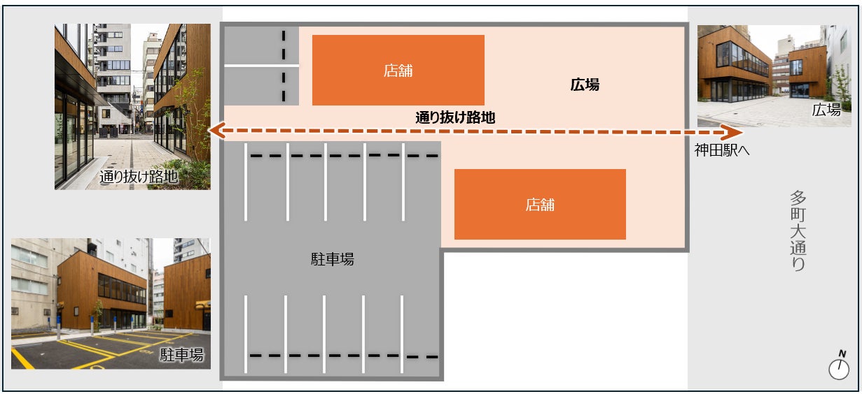 地域のイベントが行われる際に開放できる約130㎡の広場、東西方向をつなぎ回遊性を向上させる路地、神田の歴史を継承する秋田県産の杉を用いた2棟の店舗棟から成り立っており、当社は本物件を通じ、神田駅西口エリアの賑わい創出と、地域のみなさまのさらなるコミュニティ形成に貢献してまいります。