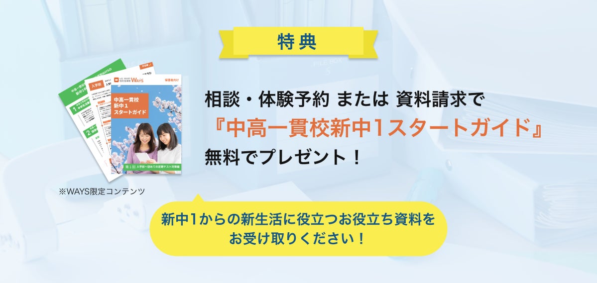 お問い合わせ、または資料請求をされた方全員に、WAYS限定コンテンツ『中高一貫校 新中1スタートガイド』を無料でプレゼントいたします。まずはお気軽に資料をご請求ください!